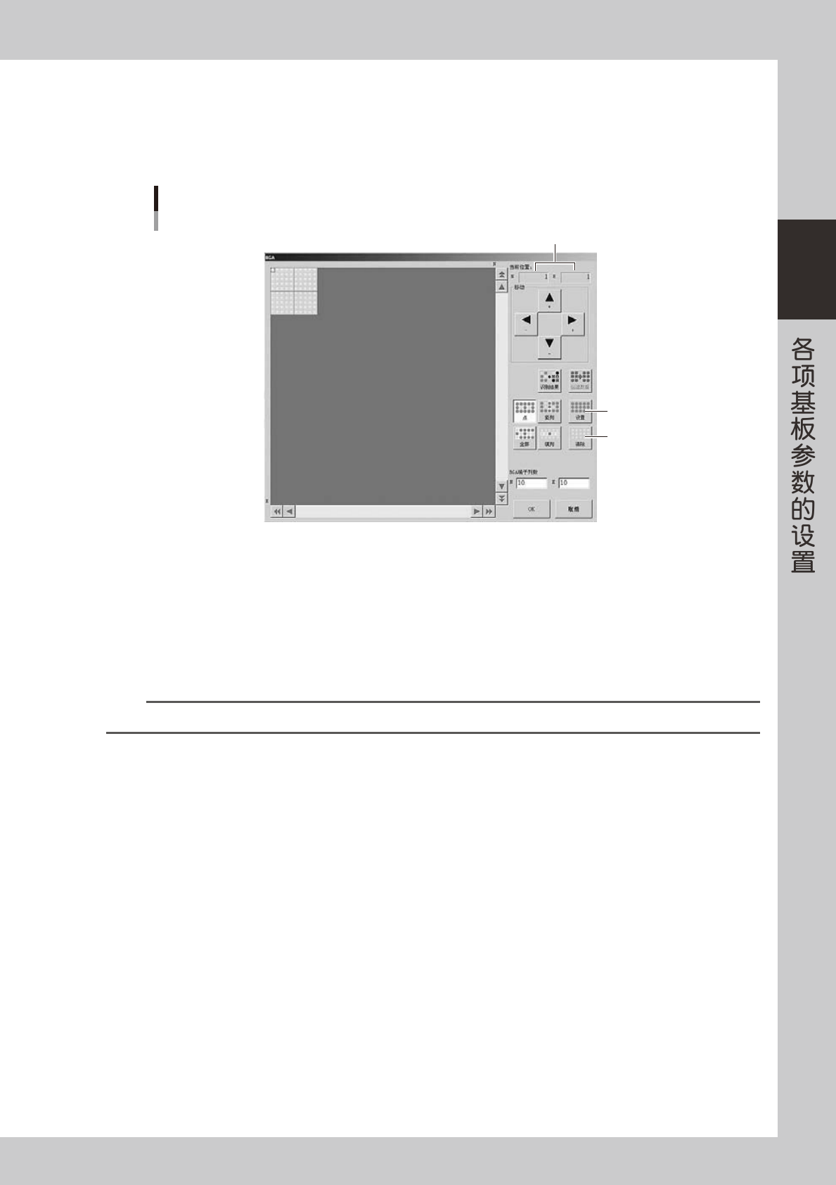 2-62 2 6. Ball 元件的编辑 使用元件调整可编辑 Ball 元件的位置信息。识别元件时,如果使用此位置信息,可以对 CSP 等微型 BGA 类元件和 不规则排列的球进行识别。想要编辑 Ball 元件,必须将基本参数的“校正类型”设置为“BGA”或“倒装芯片” 。 6.1 BGA 1 打开 BGA 的元件调整画面。 按 [ 元件调整 ] 按钮,打开“元件调整”画面。 2 按 [BGA] 按钮,打开“BGA”球编辑画面。 …