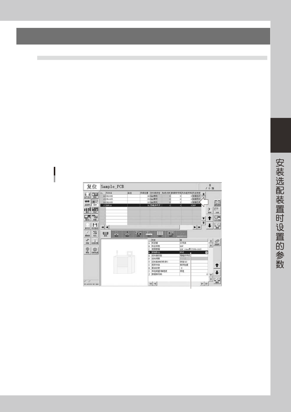 3-2 3 4 设置“送料器类型”参数。 从下拉框中选择“宽幅多杆式”或“多杆式” 。 送料器类型的选择 26301-P2-00 5 设置“送料振动时间 ( 秒 )”参数。 送料振动时间是设置送料器机体的振动时间 ( 传送元件的时间 ) 的参数。 默认值为“标准 (0)”即振动 2 秒钟。 根据元件的具体情况在 +0.4 〜 -3.5 秒的范围内设置。 n 要点 一般,机器设置内的送料振动时间为 2 秒。如果选择 -2.0 以上的值时,…