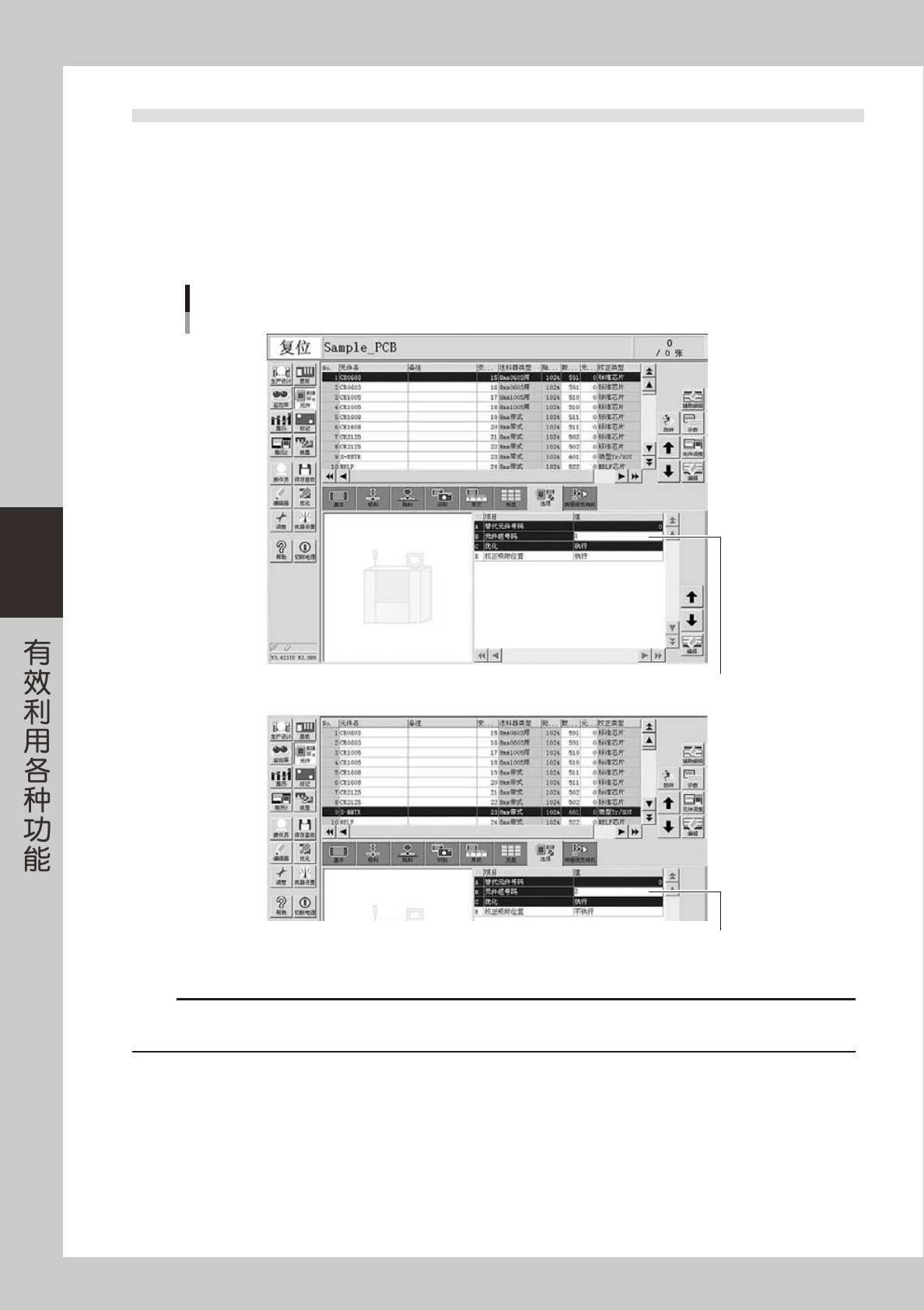 4-15 4 4 输入替代元件的号码。 1. 按 [ 辅助编辑 ] 按钮,返回前一画面。 2. 选择元件一览表的“No.1” ,在“选项”画面的“A. 替代元件号码”中输入“12” 。再移至“No.12” , 同样将“选项”画面的替代元件号码设置为“13” 。 “No.13”的替代元件号码为“1” 。 因此,如果 No.1 的元件用完,就会自动切换为 No.12,如果 No.12 的元件用完,就会切换到 No.13, 其间,在 No.1…