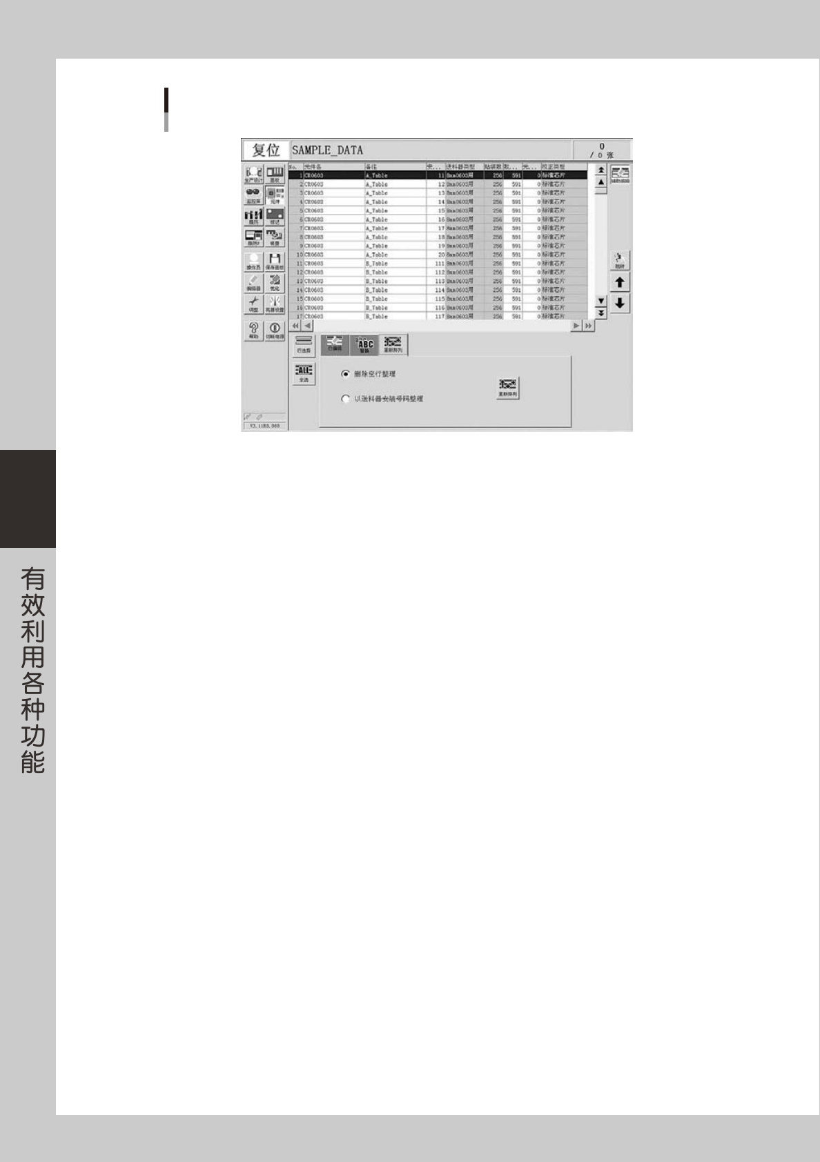 · [ 元件 ] 按钮画面内的项目为:“删除空行整理”和“以送料器安装号码整理”。