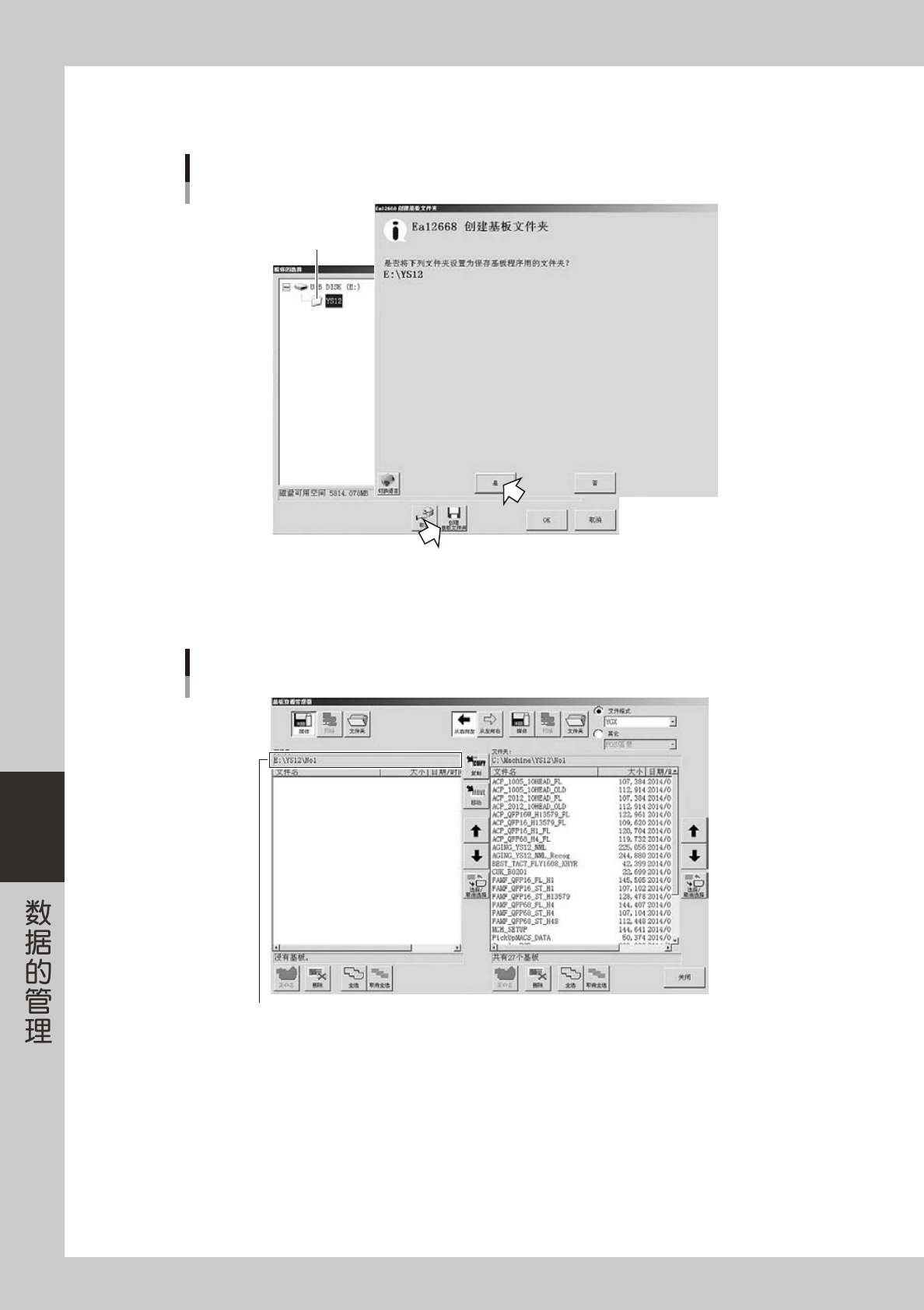 6-4 6 2. 选择创建的文件夹,按 [ 创建基板文件夹 ] 按钮。 显示“创建基板文件夹”的对话框,确认内容后,按 [ 是 ] 按钮。 创建基板文件夹 选择文件夹 26607-P2-00 3. 设置完毕,返回“媒体的选择”画面。按 [OK] 按钮,关闭画面。 4. 退回基板资源管理画面后,确认“文件夹”显示框中是否已创建 No.1 目录。 目录的确认 确认已创建No.1目录 26608-P2-00 6 选择文件格式。 从下拉框中选择…