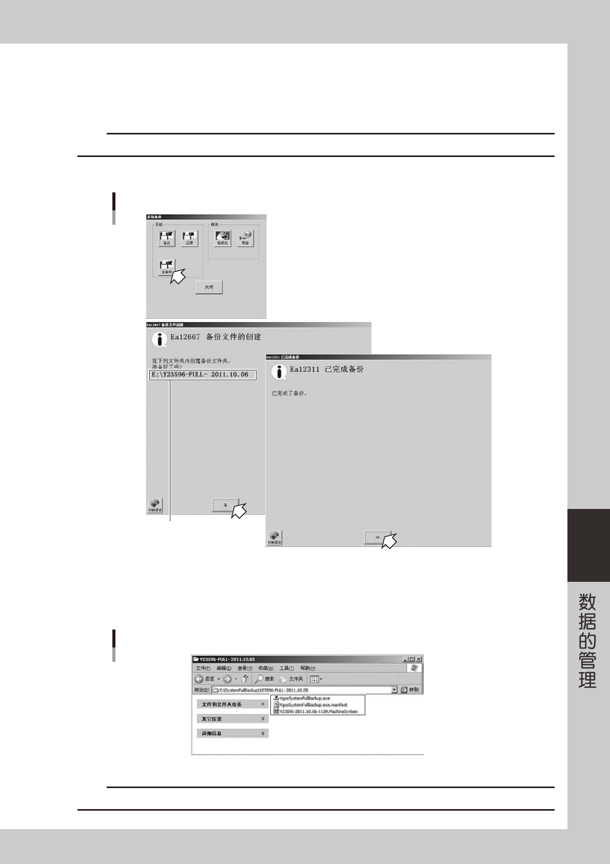 6-10 6 4 开始备份。 ■ 进行系统备份时 1. 按 [ 备份 ] 按钮。 2. 显示“备份文件的创建”对话框,确认保存位置后,按 [ 是 ] 按钮。 开始进行系统备份。 3. 系统备份结束后,显示“已完成备份”对话框。 按 [OK] 按钮,关闭画面。 系统备份 确认保存位置 26617-P2-00 4. 返回“系统备份”画面后,按 [ 关闭 ] 按钮,关闭画面。