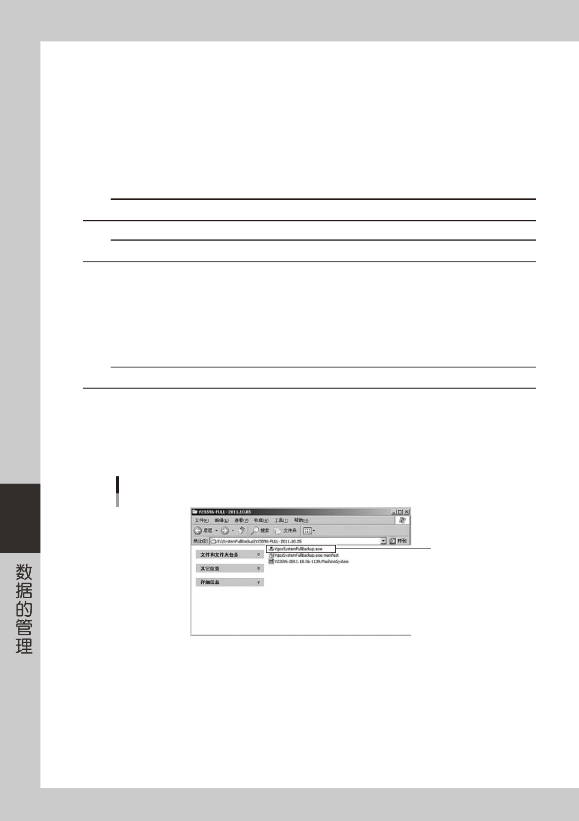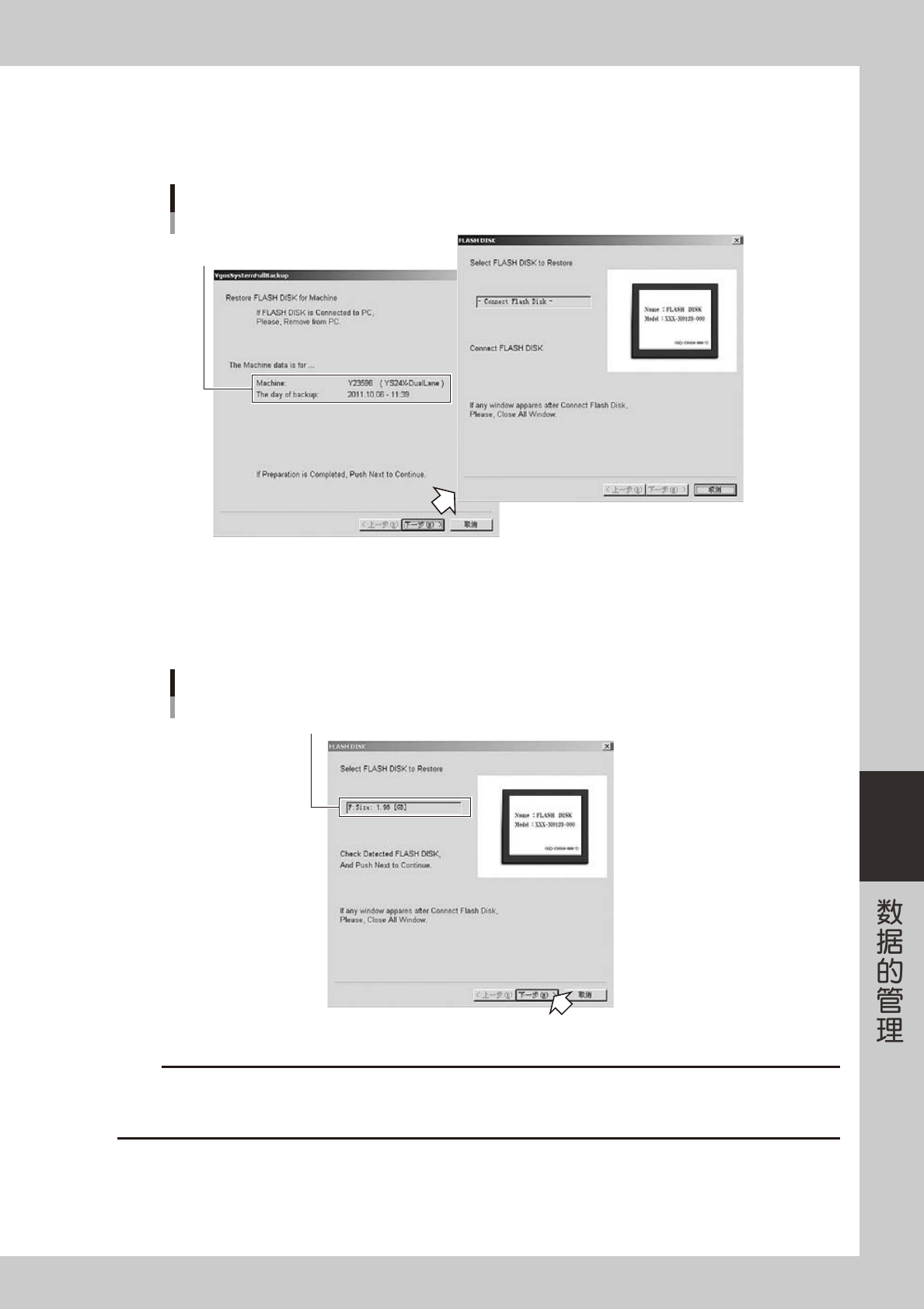 6-15 6 3 进行还原。 显示“VgosSystemFullBackup”对话框,确认显示的是想要还原的对象机器后,点击 [ 下一步 (N)] 按钮, 显示“FLASH DISK”对话框。 确认对象机器 确认 26632-P2-00 4 连接闪盘。 将闪盘连接在电脑上,电脑会检出闪盘并显示。画面上的 [ 下一步 (N)] 按钮会被激活,点击 [ 下一步 (N)] 按钮。 闪盘的连接 检出的闪盘 26633-P2-00 c 注意 ‧ …