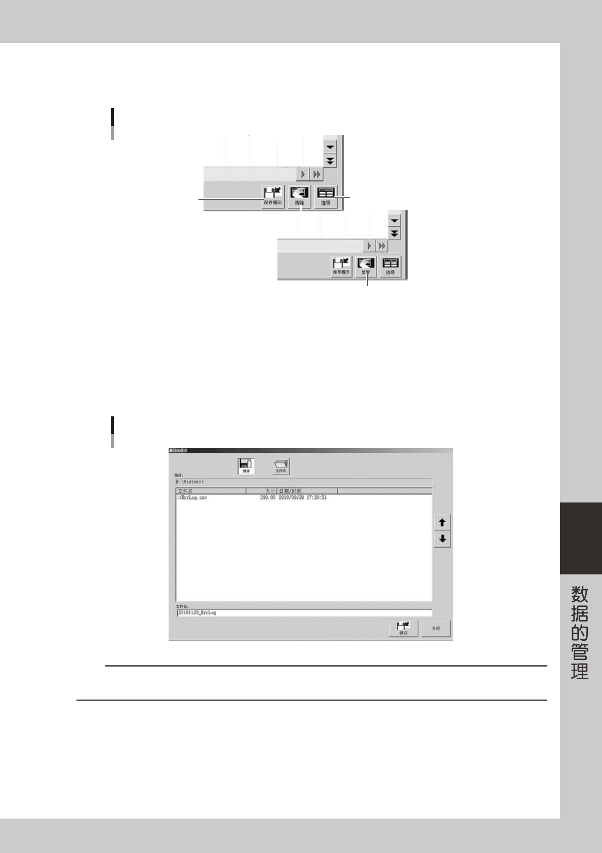 当前选项卡中的履历数据 ( 系统中记录的所有履历 ),可保存到 USB 存储器或网络驱动器等任意位置。