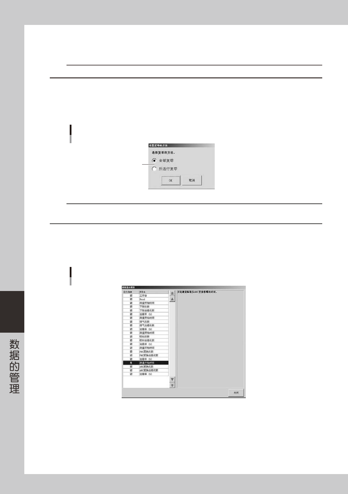 6-28 6 [ 清除 ] 按钮 ( 此按钮只在履历画面中显示 ) 可以清除当前显示的选项卡中的所有履历数据。但不能以行为单位清除数据。 显示确认清除的对话框之后,按 [ 是 ] 按钮。 c 注意 被清除的数据无法复原。 [ 复零 ] 按钮 ( 此按钮只在履历 2 画面中显示 ) 可使当前正在显示的选项卡中的内容复零。 1. 显示“设置复零的方法”画面,选择复零的方法之后,按 [OK] 按钮。 2. 显示确认对话框之后,按 [ …