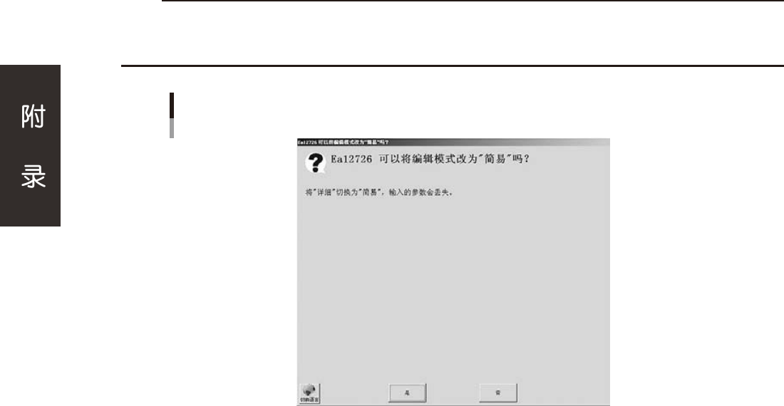 A-18 c 注意 简易编辑模式会自动在参数中设置数值。因此,在编辑过程中,如果将编辑模式从详细切换为简易,会丢失在此之前设置的参数。 此时,会显示如下图所示的警告画面。 想要切换编辑模式时,务必备份元件数据之后再切换。因丢失的参数无法复原,请务必在慎重考虑的基础上切换编辑模式。 切换警告画面 26704-P2-00