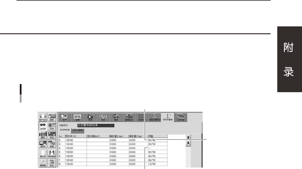 各元件的调整状况,可在 [ 监控屏 ]-“吸料率警告”-“各元件信息”画面的“调整”栏中查看。