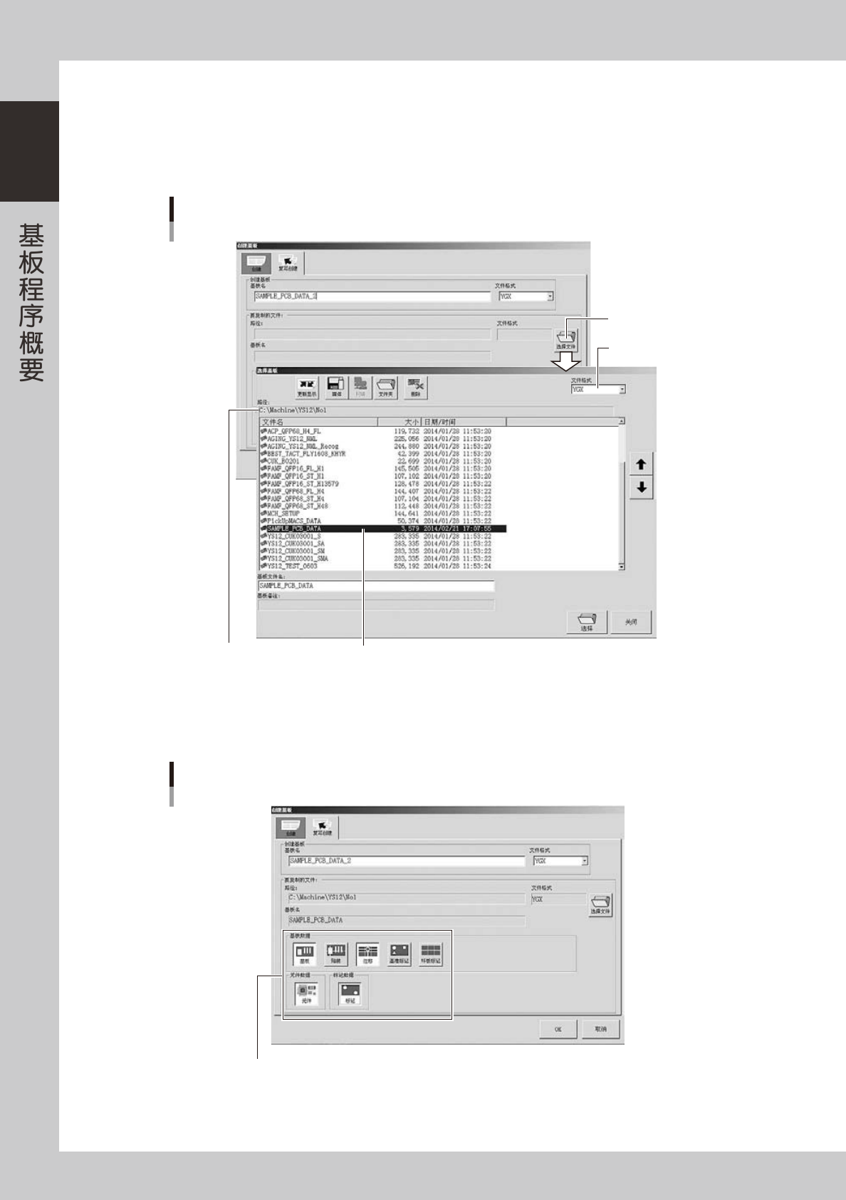 1-5 1 ■ 下面,介绍“2. 利用已登录的基板程序”的方法。 1 按生产设计画面的 [ 创建基板 ] 按钮。 打开“创建基板”对话框。 2 在“复写创建”选项卡的基板名输入框中,输入基板名。 选择文件格式,用键盘输入基板名。 ‧ 文件格式为 VIOS 时,可用半角英文和数字在 20 字以内输入。 ‧ 文件格式为 YGX 时,可用半角英文和数字在 260 字以内输入,但状态区可显示的字数只有 40 字左右。 n 要点 基板名可使用的…