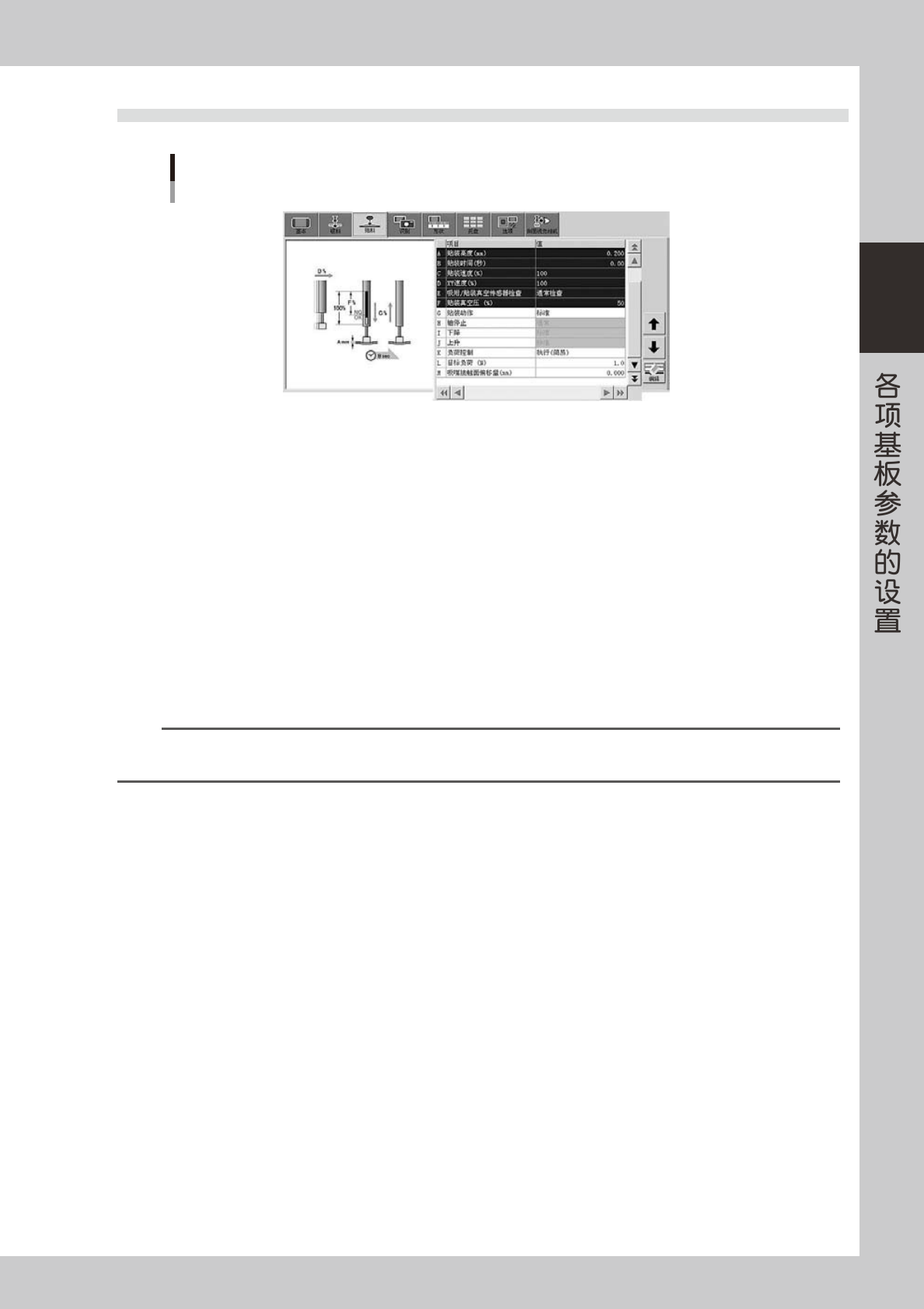 2-32 2 J: 吸附 / 贴装真空传感器检查 一般设置为“通常检查” 。如果想要更严格地检查吸附错误和元件被带回的现象,设置为“特殊检查” 。如果想要对 QFP、 BGA 等元件的吸附错误和带回元件现象比其它元件作更严格地检查时,设置为“特殊检查” 。 n 要点 设置为“通常检查” , 可以控制吸贴元件时下降后的贴装头开始上升的时机。 “真空传感器检查”的设置只在基板信息的“负压确认” 设置为“执行”时才有效。 K: 吸附真空压 此…
