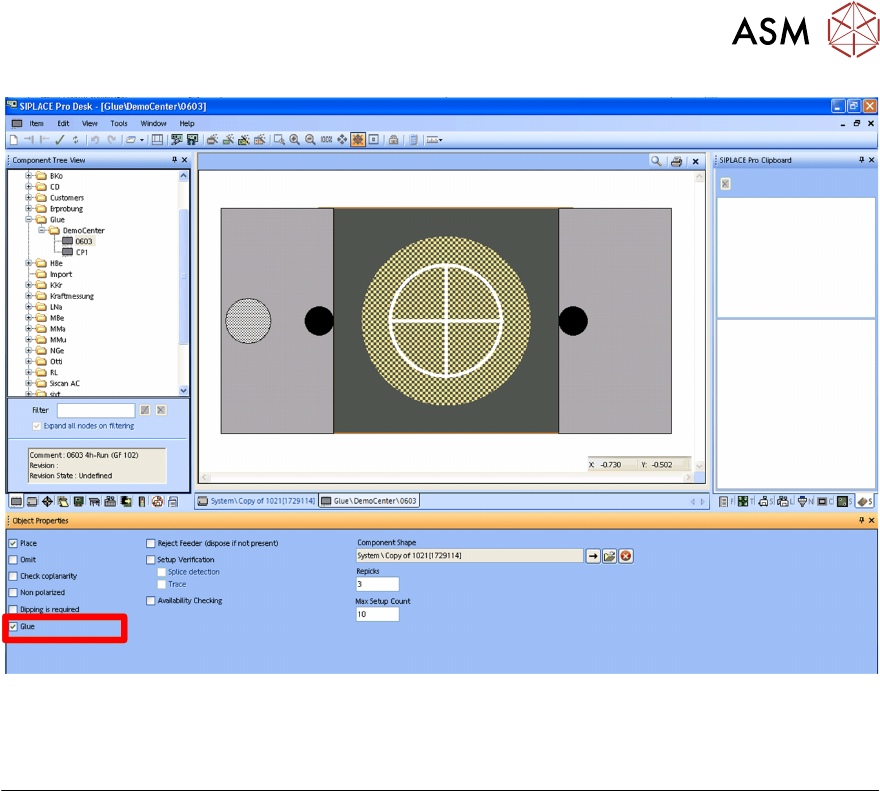 4 Operation 4.1 Settings in SIPLACE Pro 10.1 and Higher User Manual SIPLACE Glue Feeder 05/2020 39 The object properties for the selected component will be shown. The diagram shows the option Glue marked. Gluing If this …