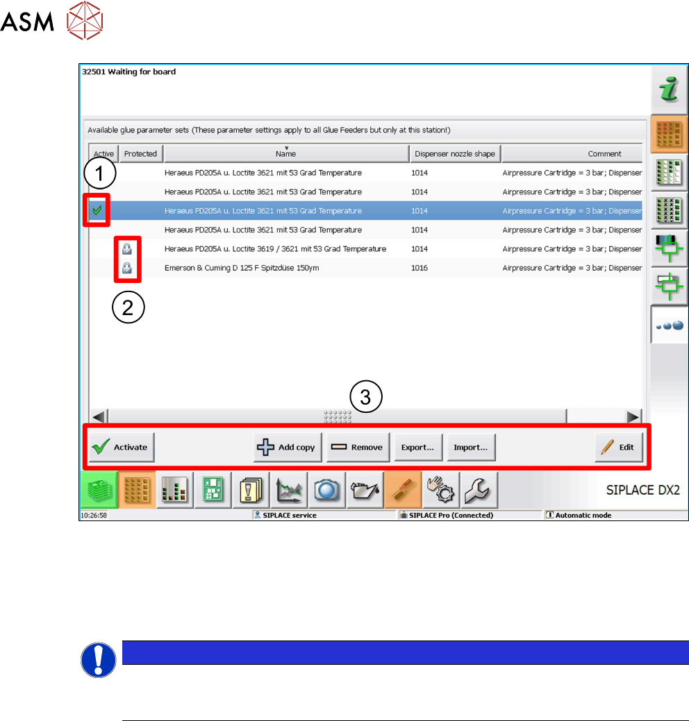 The icon in the Active(1) column marks the parameter set which is currently set for the Glue