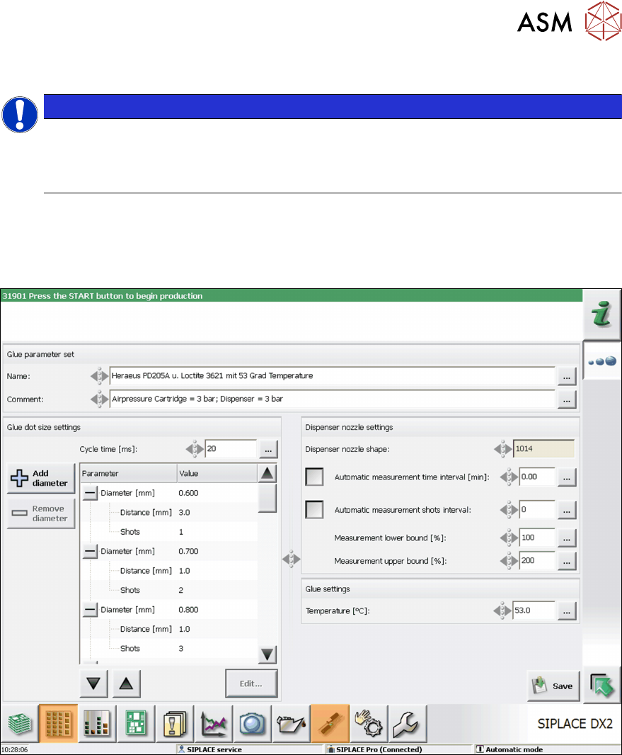 4 Operation 4.2 Individual Functions in Stations Software 706.1 and Higher User Manual SIPLACE Glue Feeder 05/2020 57 4.2.5.1 Editing Parameter Sets NOTICE Protected parameter sets The protected standard parameter sets, …
