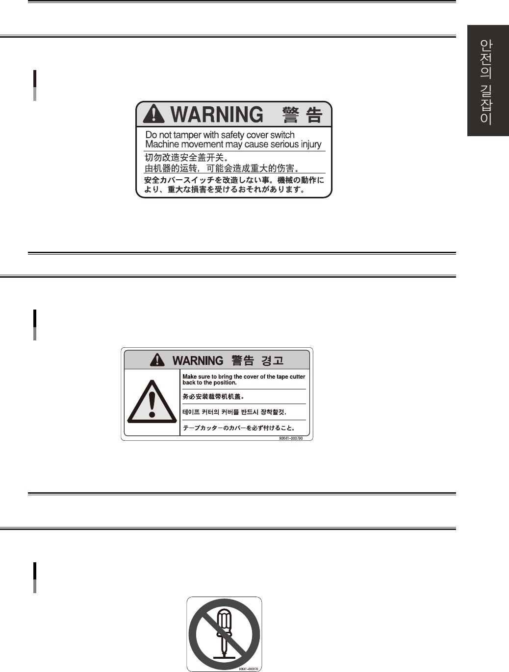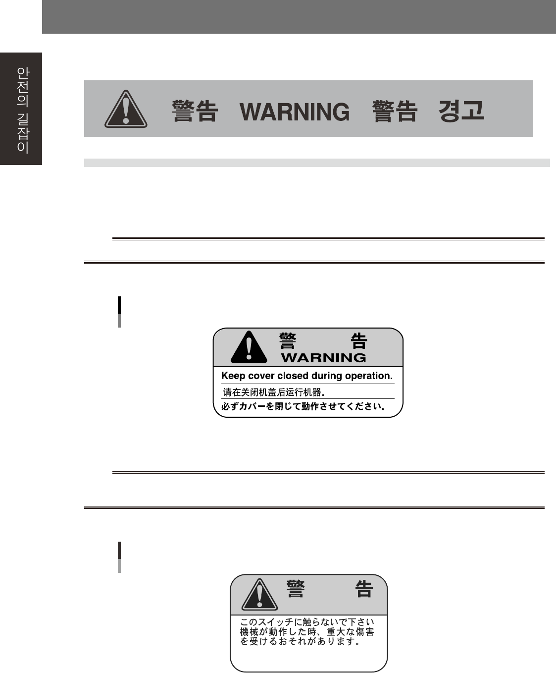 x 3 . 경고 라벨과 부 착위 치 야마하장비 를정확하 고안전 하게사용 하 기위 해서 ,본체및각주변 장치에 는경고 라벨 이부착되 어있 습니 다 . 이경 고표시내 용을준수하 여주십 시 오 . 3 . 1 경고 표 시 3. 1 . 1 커버의 취급 ■ 경고 내용 w 경고 커버를 열어 둔채로 운 전하 면 가 동 부 가 신체에 닿 아서 다 칠위험이 있 습니 다 . ■ …