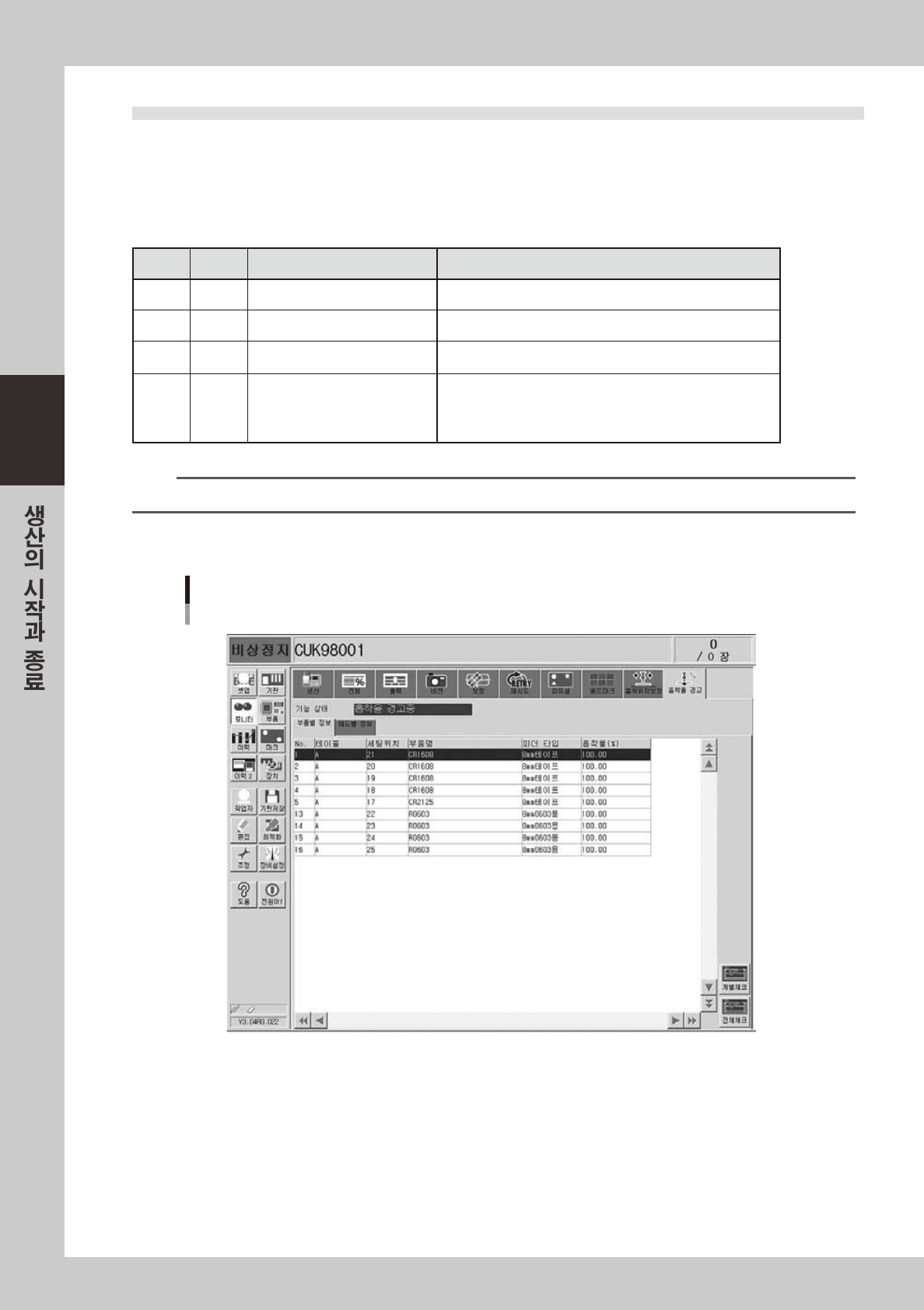 행은 표시되지 않습니다 . 운전중인 흡착율 상태는 행의 색에 따라서 판별할 수 있습니다 .