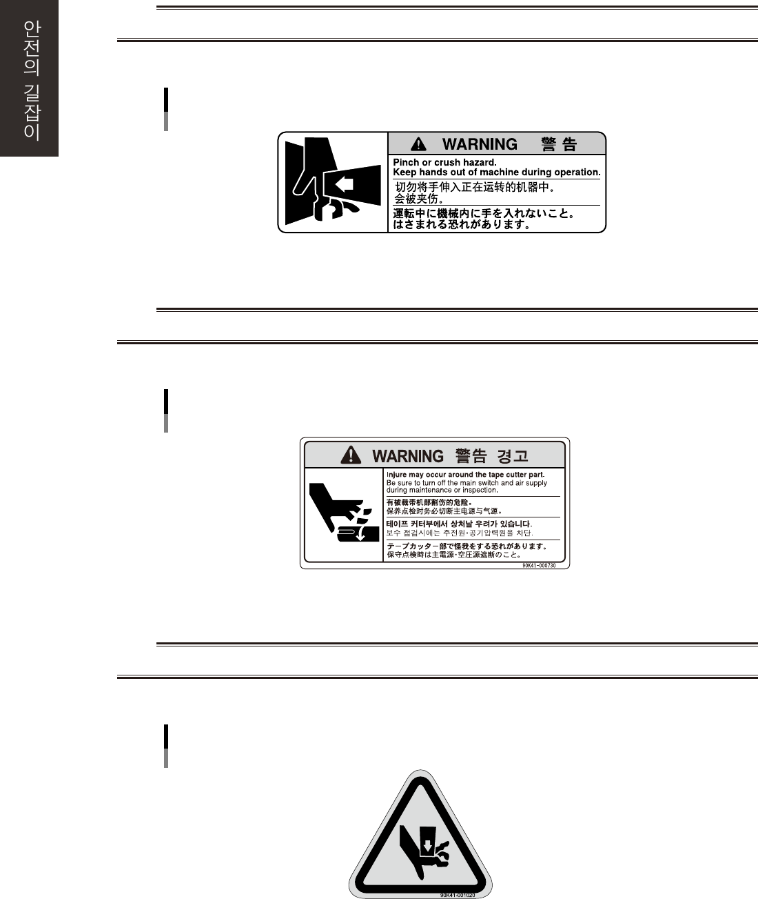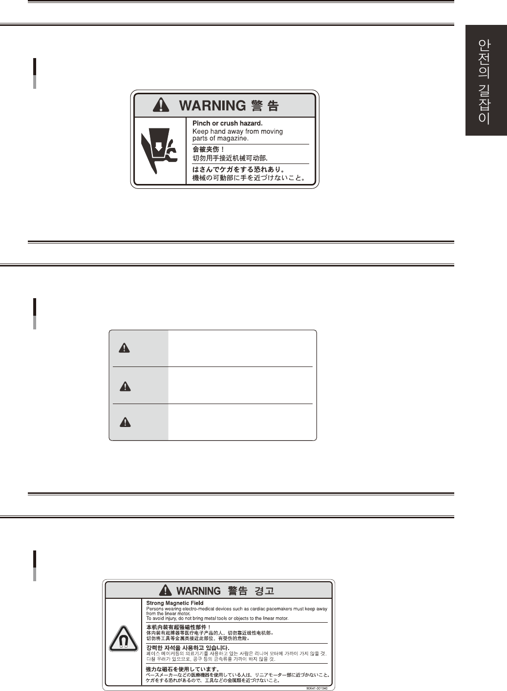 xiii ■ 경고 내용 w 경고 매거 진의 취급 시 , 손 등 을 절 대로 장 비내에 넣 지 않는 다 . 가 동 부 에 손 이나 손가 락이 끼 여서 다 칠 우려가 있 습니 다 . ■ 대 상장 비 트레 이체인저 (Y G 시리즈 , YS 시리즈 ) 끼여서 다칠 위험 있음 9 0 K41 - 0 0 0 4 70 ■ 경고 내용 w 경고 방전 침을 만지지 말것 , 분 해하지 말것 , 물 을 끼얹지 …