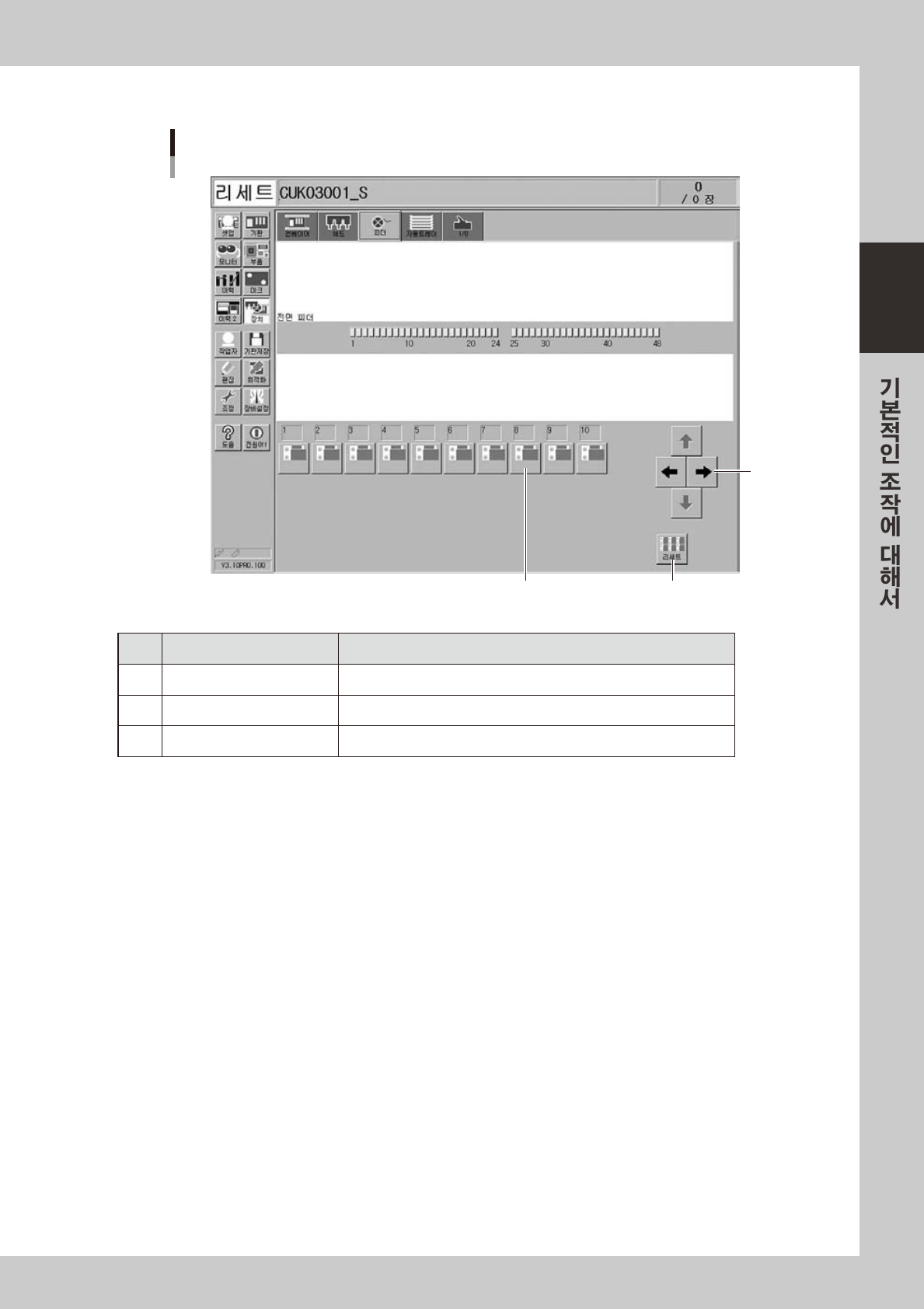 2-15 2 ■ 피 더 수동조작 [장치] ー 「피더」화면 1 2 3 2 8 210 - M 7- 0 0 버튼명 기능 1 좌우화 살표 표시할구동밸 브번 호화면을스크 롤합니다 . 2 구동밸브 피 더셔터구동밸브 를O N/O FF 시킵 니다 . 3 리세트 모 든구동밸브 를일괄해서O FF 합니다 .