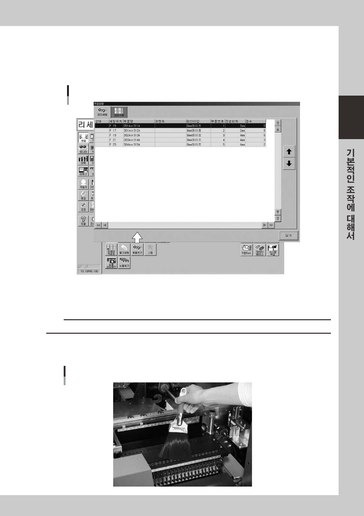 2-29 2 3. 실 장 기에 의 설치 테 이 프피더 를실장 기 에장착하 는순서 를설명 합니 다 . 1 피 더세 팅 위 치 를 확 인 합니 다 . [ 셋 업 ] - [ 부품 보기 ] 버 튼을눌러 서 , 「셋업 일 람」화면 에서피 더 세 팅위치 를확 인 합니다 . 셋업일람 2 8 218 - M 7- 0 0 e 2 비 상정 지 버 튼을 누릅 니 다 . 실 장 기 의비 상정 지…