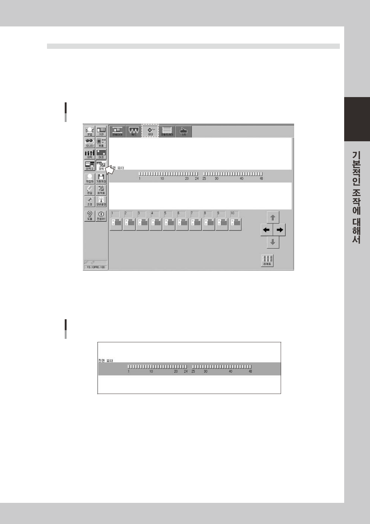 2-38 2 3 동작 시 킬 피 더 의 아 이콘 을 클 릭 합 니 다 . 화면하부의피 더리 스트 에 서 ,구동 시 킬피 더 가세 팅되 어있 는플레 이 트번 호의아 이 콘을클 릭 합니 다 . 클릭 함으로서에 어 가ON/OFF 됩 니 다 . 수 차례클릭 해서피 더 를구동시 켜 ,오 동작 이없 는 지확인해주십 시 오 . 피더화면 피더선택 28 22 7-M…