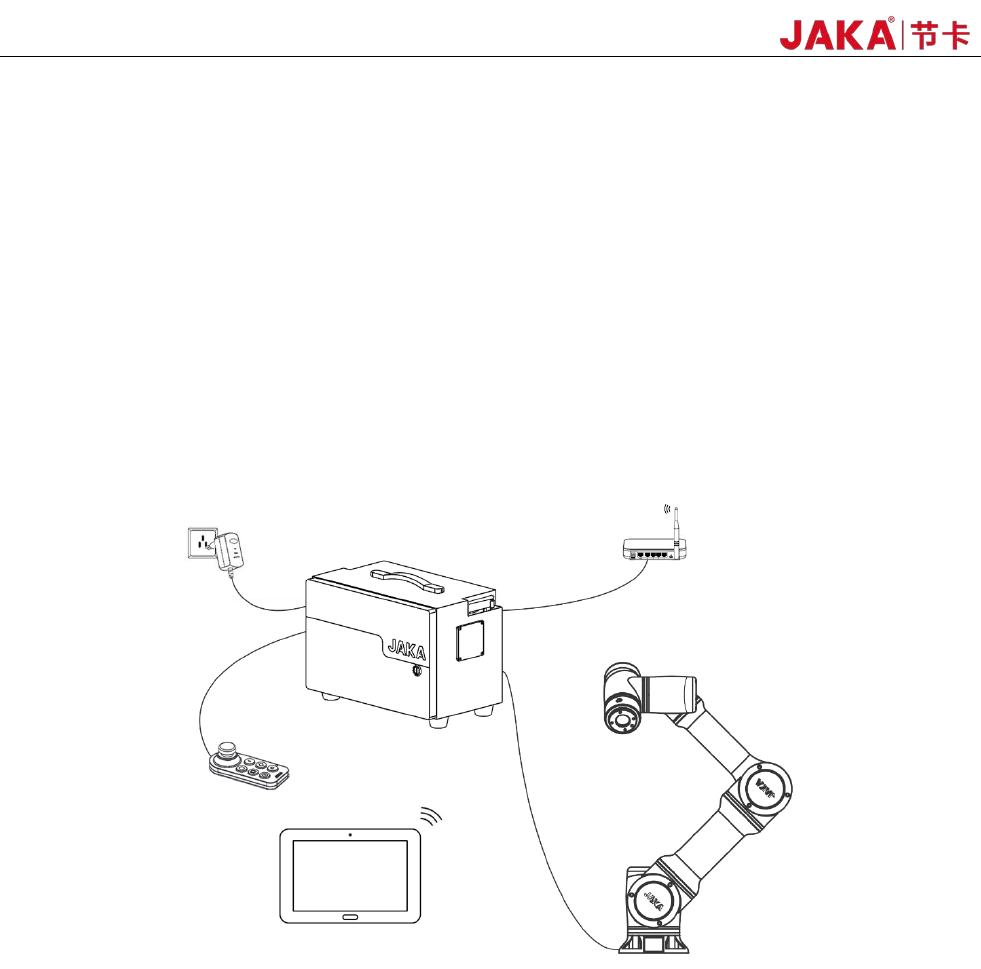 如图 2-1 所示,JAKA Zu 系列机器人使用无线互联的方式,使用时需要包括以下几个部件: