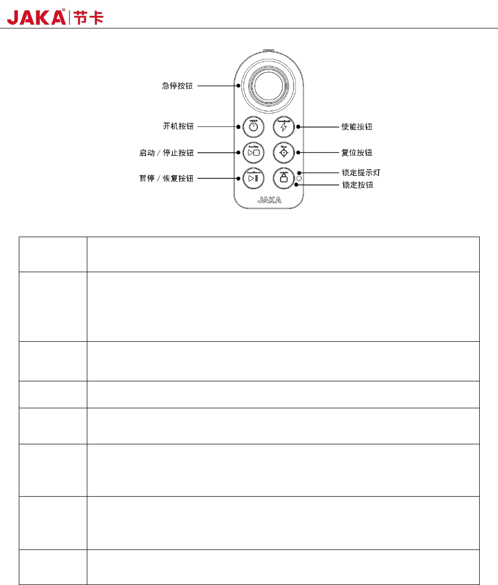 JAKA Zu 12 v 1.0 13 图 2-4 手柄按键功能说明 开机 开机: 短按 1s 开机键后松开,蜂鸣器响, 电控柜开机 。 关机: 长按开机键 3s 以上,手柄蜂鸣 6~7 次,电控柜关机。 使能 机器人通电: 电源未打开情况下,短按则机器人上 电。 机器人断电: 电源打开情况下,短按则机器人关电 。 机器人上使能: 电源打开情况下,短按锁定键 + 使能键 。 机器人下使能: 机器人使能情况下,短按锁定键 + 使能 键。 …
