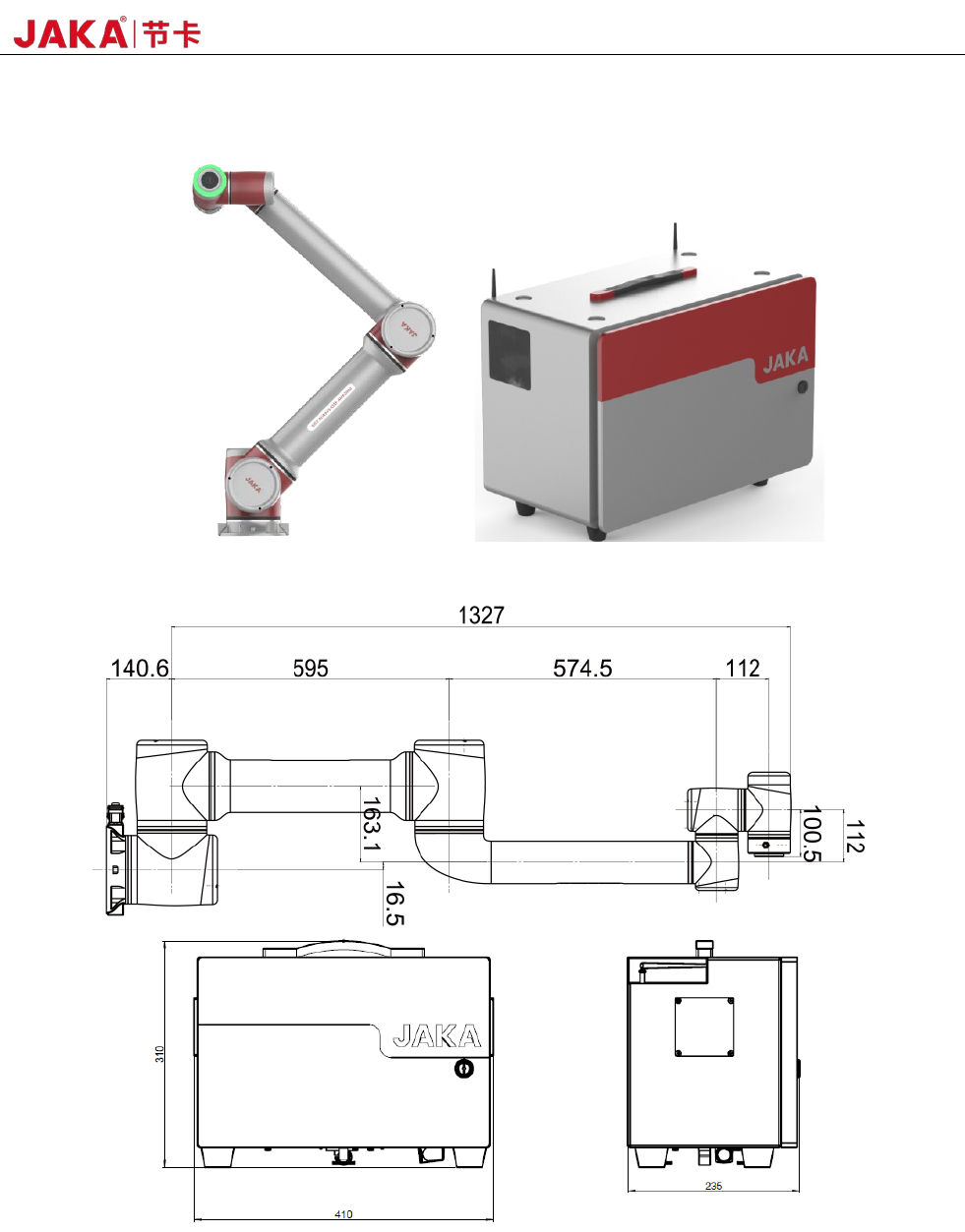 JAKA Zu 12 机器人与电控柜的实物照片与外形尺寸如图 3-2、图 3-3 所示。在安装时务必考虑到机器人的