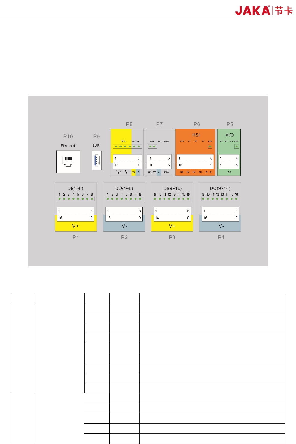 JAKA Zu 12 v 1.0 21 6 DO6 第 6 路数字输出, PN P 型, ≤ 1A 持续电流输出能力 7 DO7 第 7 路数字输出, PN P 型, ≤ 1A 持续电流输出能力 8 DO8 第 8 路数字输出, PN P 型, ≤ 1A 持续电流输出能力 9~16 V - 隔离电源输入负,默认 短接片接内部 GND P3 DI(9~16) 8 路数字输入 1 DI9 第 9 路数字输入, PN P 型, 高电平有效 2…