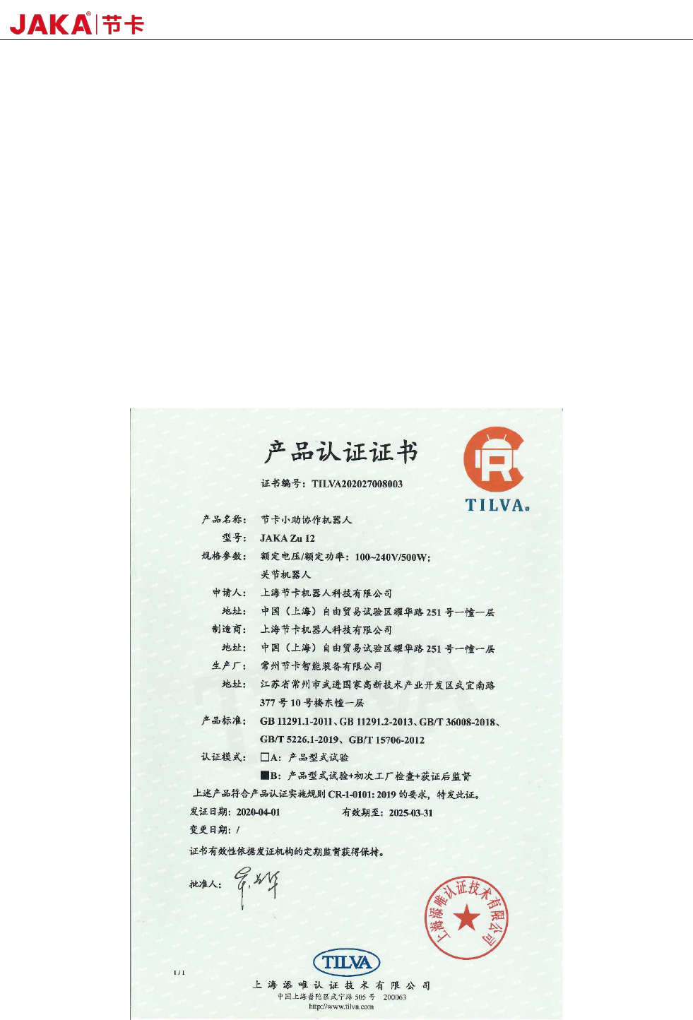 本公司产品 JAKA Zu 12 机器人,通过 CR 认证,符合 CR 认证标准关于协作机器人的相关要求,测试标准