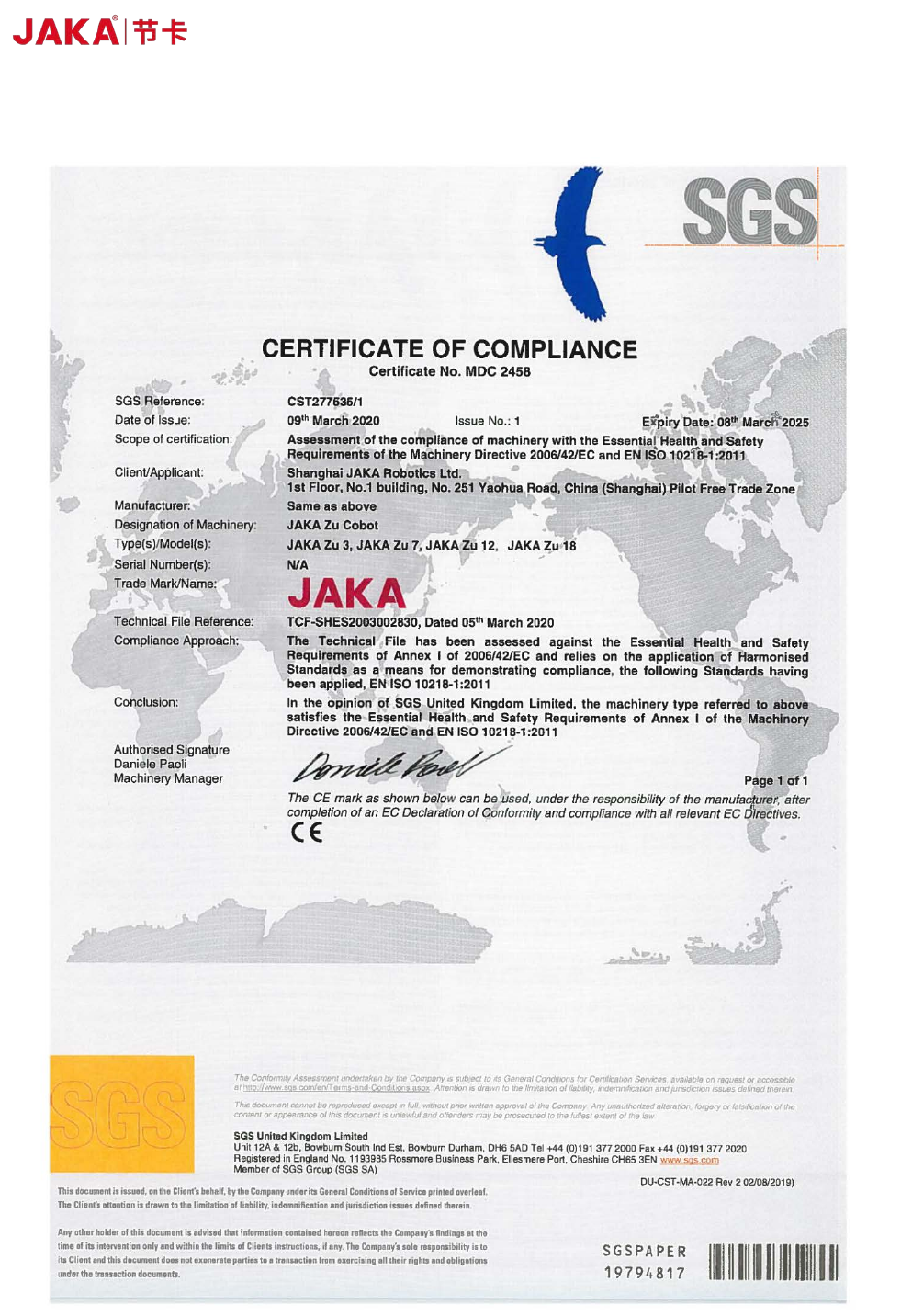 JAKA Zu 12 v 1.0 43 《欧盟机械指令 2006/42/ EC 》 《 EN ISO 1021 8 - 1:2 01 1 机器人和机 器人 装置 工 业机器人安全 要求 第 1 部分 : 机器人》 图 6- 5 功能安全认证证书