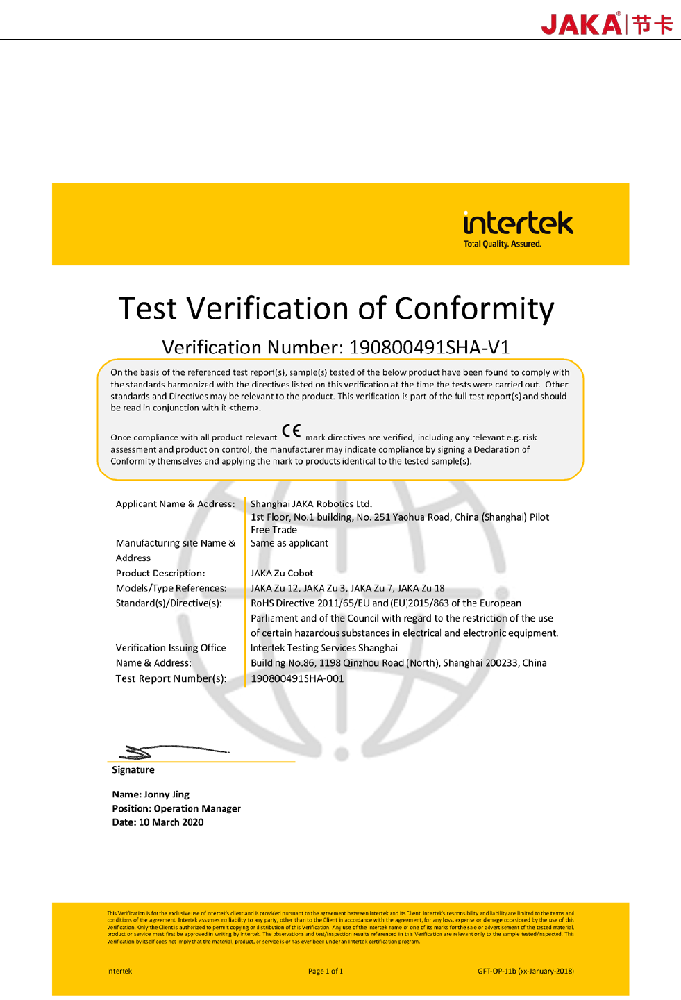 本公司产品 JAKA Zu 12 机器人,通过欧盟 RoHS 2.0(2011/65/EU)及修订指令(EU)2015/863,符合欧盟
