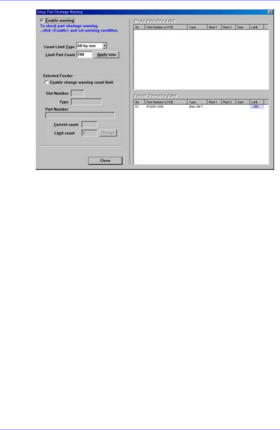 count drops below the specified number, a part shortage warning is produced and the