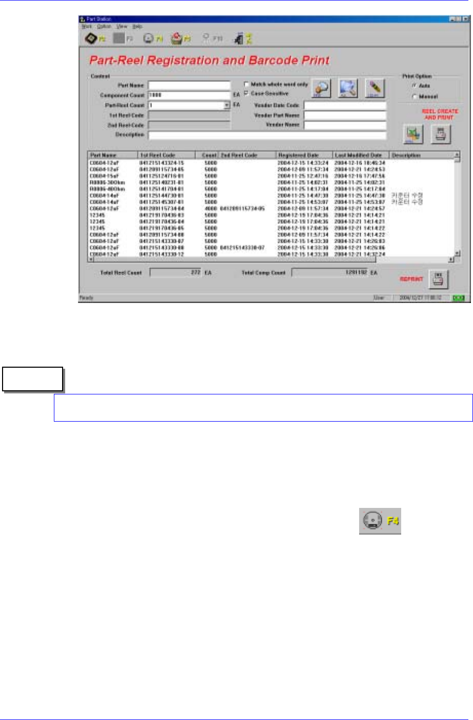 Part S tation 2-9 Figur e 2-7.Part Reel Regi stration scr een Memo When reprinting the barcode, ensure that more than two identical barcodes do not exist. If an identical barcode is attached to a diff erent part reel, …