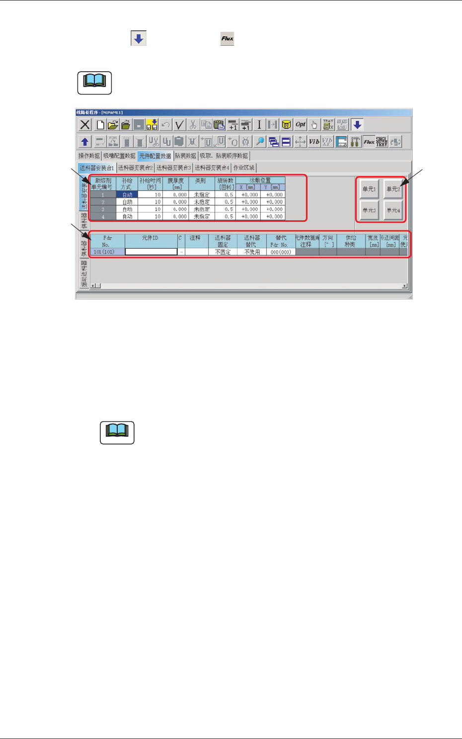 6-2 0802-003 打开 “ 元件配置数据 ” 的 “ 送料器安装台 1 ” 选项卡。 按下图标 ( ),再按图标 ( ),打开 “ 送料器安装台 ” 选项卡编 辑 “ 送料器安装台 ” 数据。 Note 送料器安装台 2、3 以及 4 的选项卡也可用同样的操作显示。 Fig.21 “ 送料器安装台 1 ” 选项卡 [1] 助熔剂 ( 助焊剂 ) 单元编号 1 ~ 4 补给方式 选择助焊剂补给方式为 “ 手动 ” 或 “ 自动 ”…
