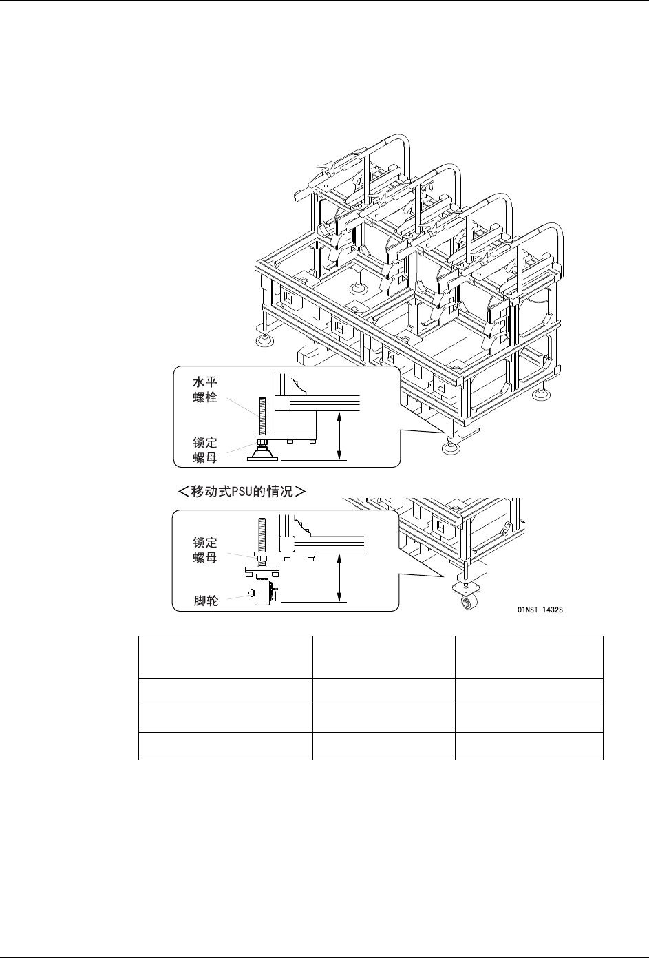 2. 转动水平螺栓,调整至 PSU 机架下面到地面的高度 (H)到达规定值。