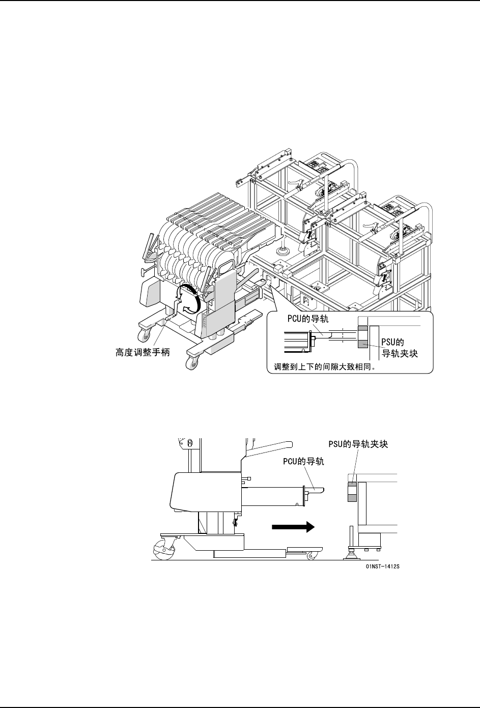 1. 请转动 PCU 的高度调整手柄,将 PCU 的导轨对准 PSU 的导轨夹块的高度。