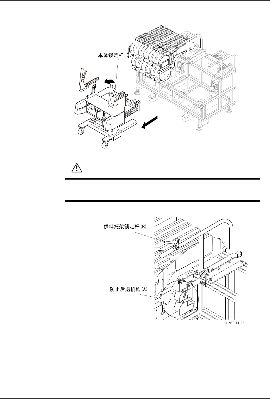构 (A)和托架锁定杆 (B)。料站托架有可能落下。