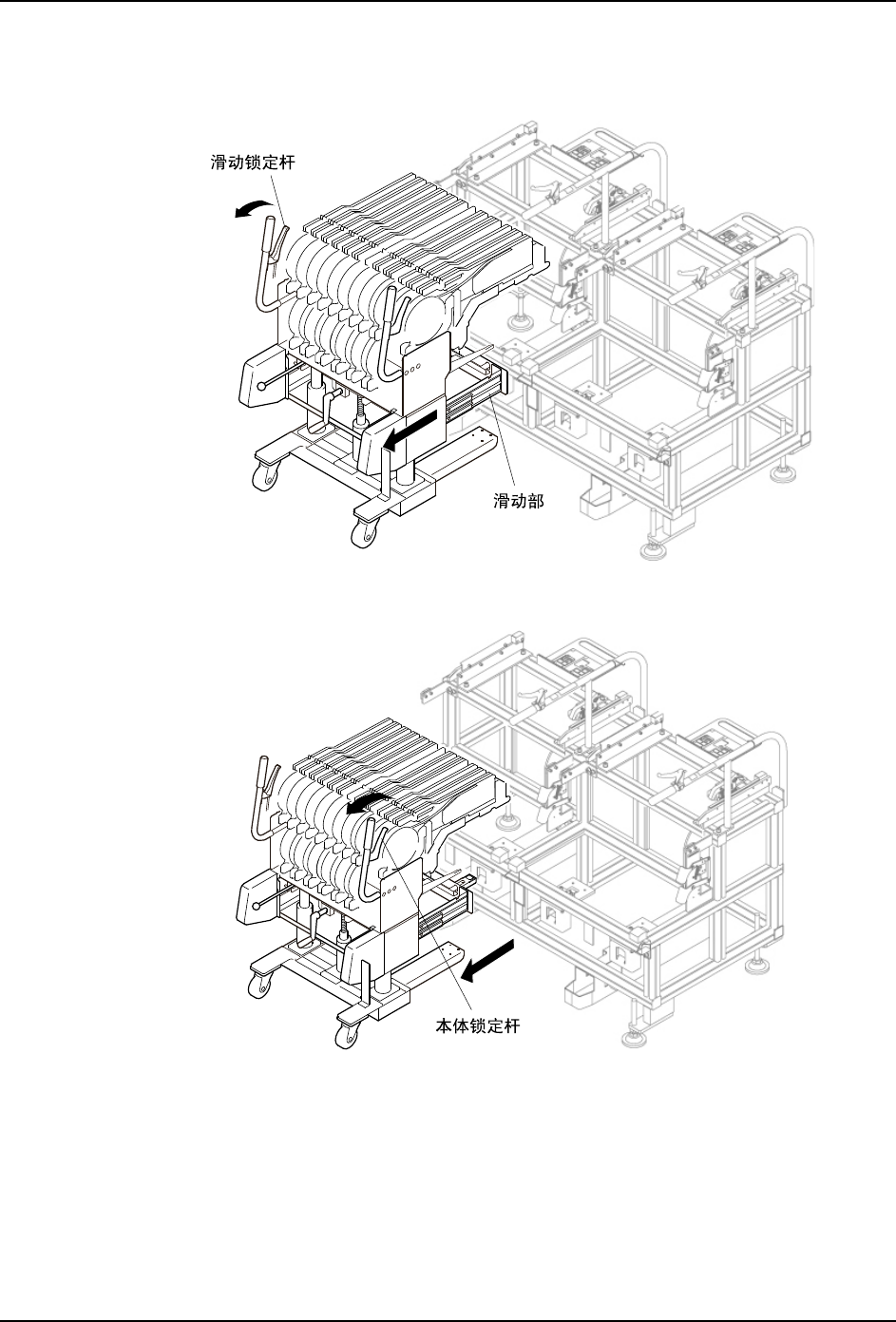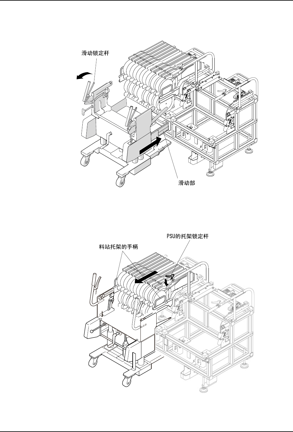 INS-NXTPSU-3.1S 3. 基本操作 PSU 使用说明书 29 3. 握住 PCU 的滑动锁定杆,解除滑动部的 锁定。 4. 并且,向前推入 PCU,在前进端位置松开滑动锁定杆。 5. 握住 PSU 的供料托架锁定杆,解除供料 托架的锁定。 6. 握住料站托架的手柄,将料站托架 从 PSU 滑动到 PCU 上。 备注 )料站托架在 PCU 上被自动锁定。 01NST -1420S 01NST -1421S