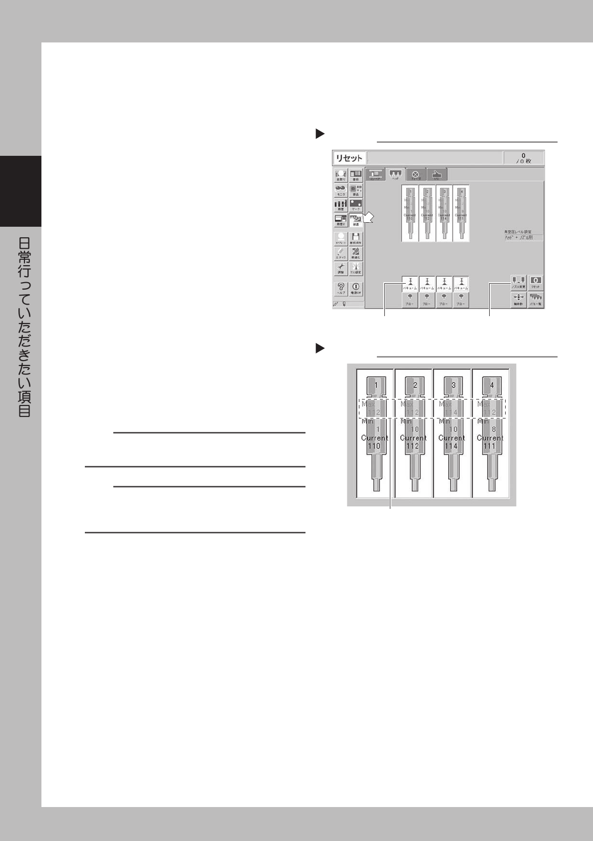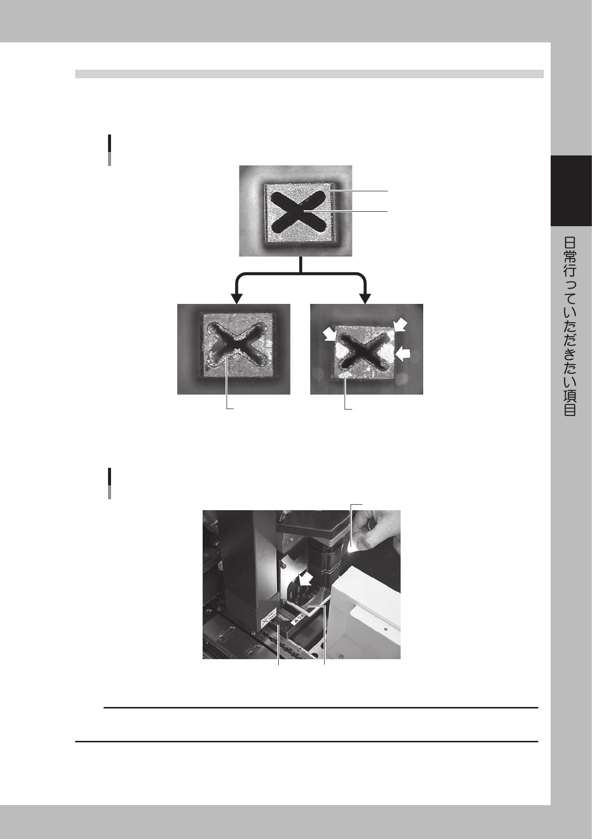 上記の確認を行った上でノズルの汚れまたはノズル詰まりが発見された場合は、直ちに「第 3 章1.1ノズルの清掃」を実行し