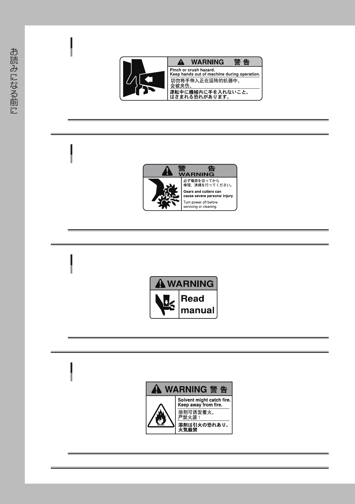 機械には警告ラベルが貼られていますので、内容を確認して指示を必ず守ってください。ここでは、サーフェ
