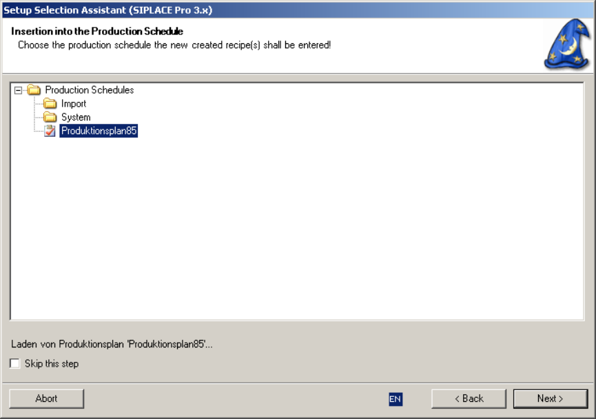 Select a production schedule and select “Next” to enter the recipes of the job into the production schedule