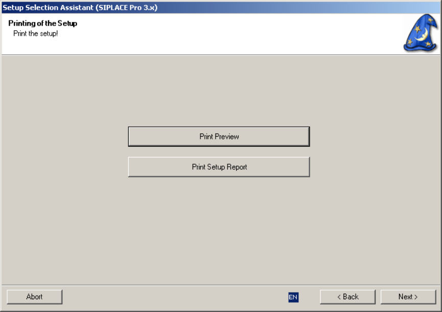 This step supports the printout of the setup which is intended to guide the setup operator to build the