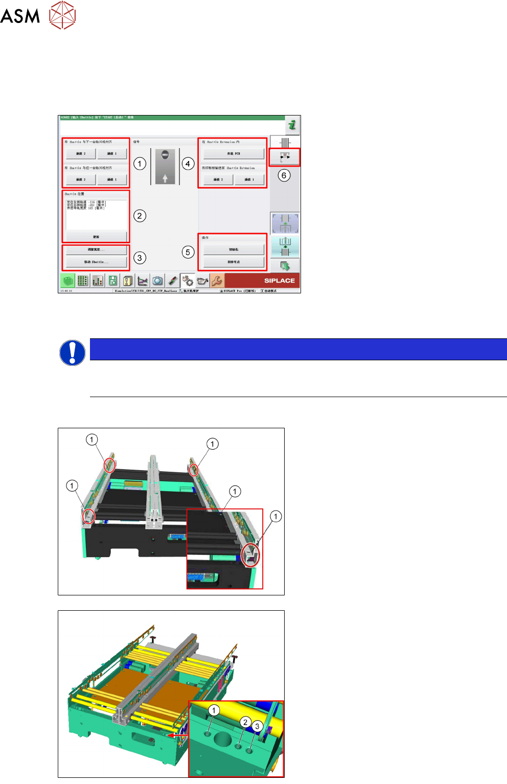6 传送导轨系统 6.6 部件更换/设置/校准 技术培训 FSE SIPLACE TX系列 08/2018 93 6.6.2.6 调整移载机 1. 以 Machine service (1-3) 级别登录。 2. 单击 Calibration (1) 菜单。 选择 Single calibration (2)。 3. 单击 Input shuttle (1) 或 Outputshuttle (2)。 4. 单击 Calibrate co…