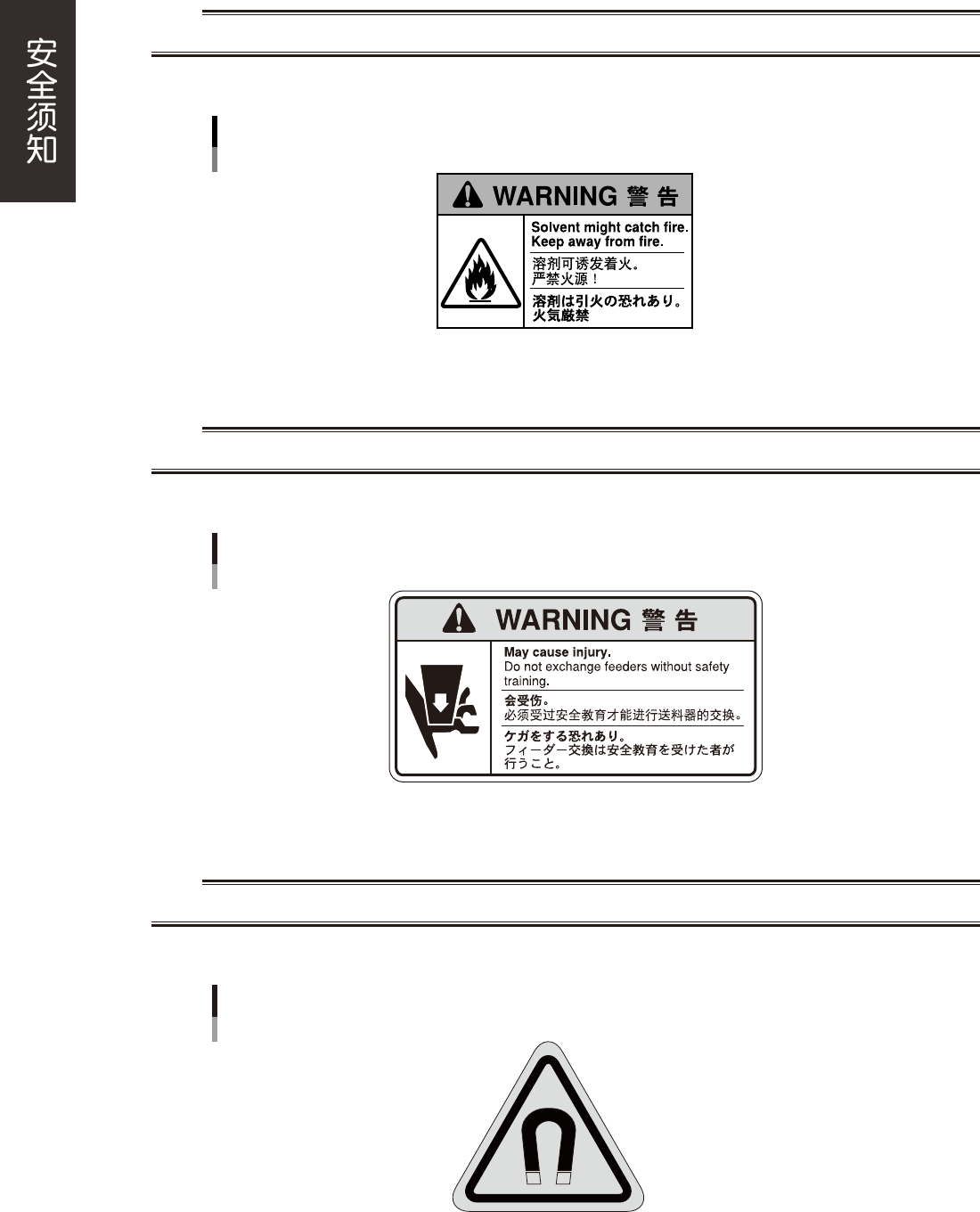 xiii ■警告内容 w 警告 手动操作时,切勿将手伸入机器内部。将手伸入,存在手和手指被机器可动部夹伤的危险。 ■ 对象机器 托盘交换器 (YG 系列、YS 系列 ) 有夹伤的危险 90K41-000470 ■警告内容 w 警告 切勿用手触摸或拆卸电极。切勿向电极淋水。否则会有触电的危险。 ■ 对象机器 贴片机所有机型 可造成触电和故障的原因。 别用手触摸电极部位。 不可私自拆分部件。 请避免部件接触水分并远离极度…