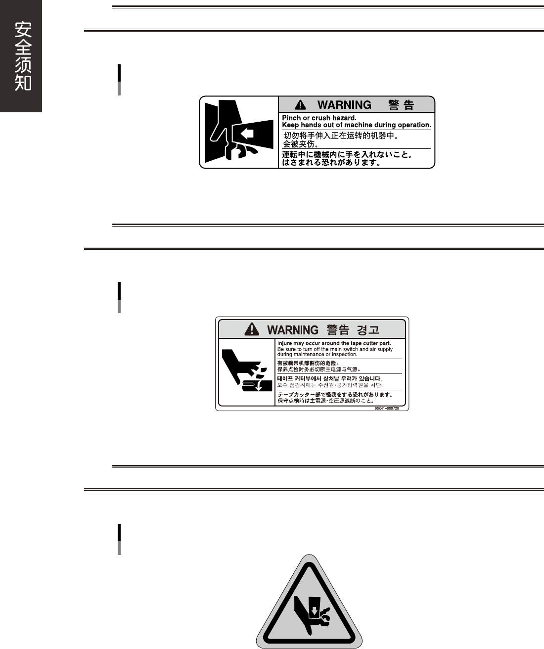 如在机器运行过程中将手伸入机器,手有被可动部和机盖夹伤的危险。