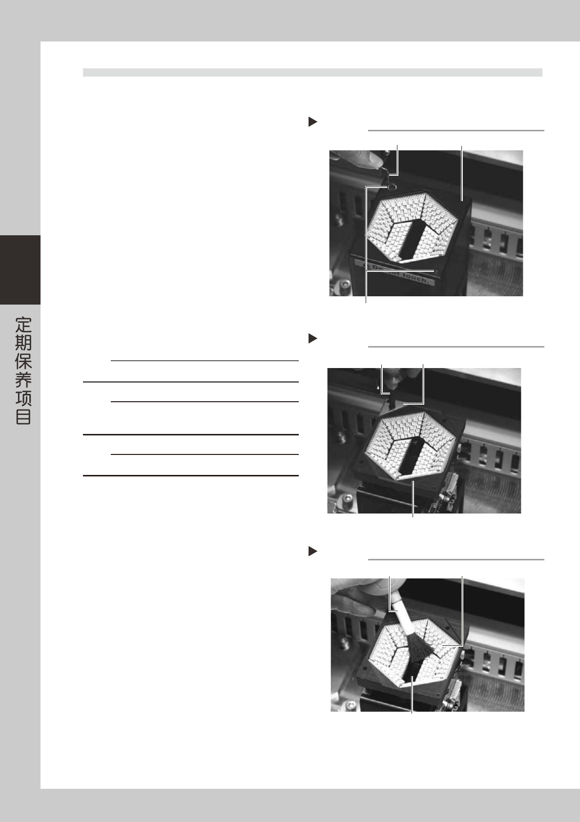 3-32 3 4.6 多视觉相机照明的清洁 (1 年 )--- 选配 多视觉相机的镜头及照明在保护玻璃内,清洁镜头和照明时必须拆除保护玻璃。如保护玻璃脏污时,也必须清洁 保护玻璃。( 参阅第 2 章「3. 相机保护玻璃的清洁」) 1 关闭电源。 退出软件程序,关闭贴片机电源。 2 拆出多视觉相机上面的相机罩。 用六角扳手拆出多视觉相机上面的 2 颗平头螺钉, 从正上方小心取出多视觉相机罩。 55345-L6-00 3 拆出照明保护玻璃。…