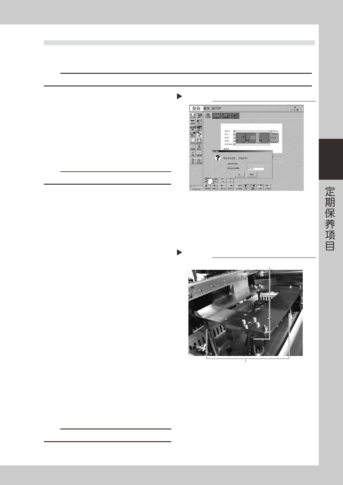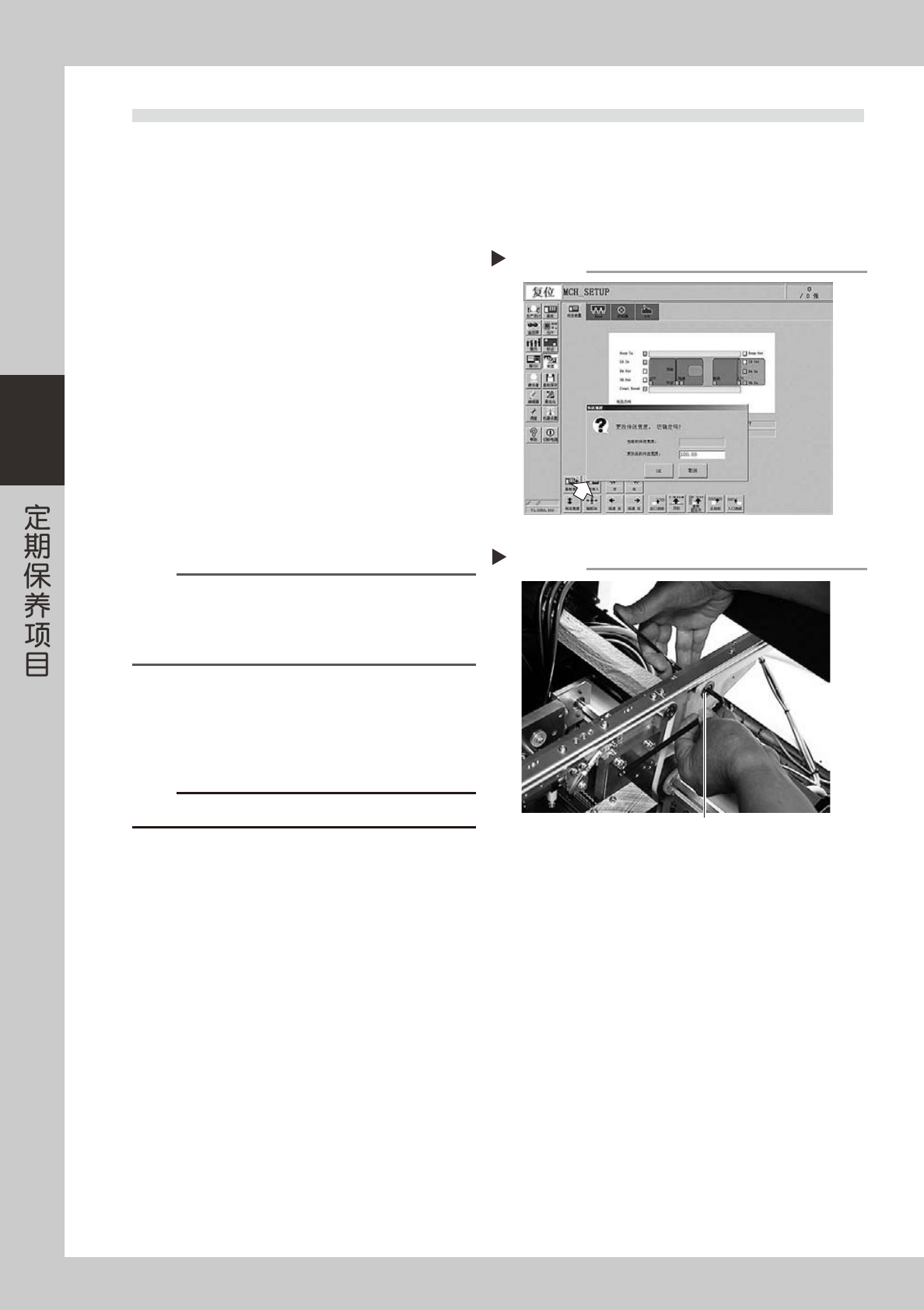 3-14 3 2.5 传送带的点检和清洁 ( 隔月 ) 点检传送带的磨损状况。 传送带传送面磨损可引起滑带, 导致无法稳定地传送基板。 必须定期对磨损状态进行确认。 此外,由于传送带磨损导致磨损粉在传送装置传感器受光面堆积,引起误检测,磨损粉在传送带导槽内堆积则可 能引起传送带粘连等故障发生。 1 将传送宽度调为易操作的宽度。 1. 按 [ 传送宽度 ] 按钮, 显示更改传送宽度对话框。 2. 在 「更改后的传送宽度」 栏里输入适当数值…