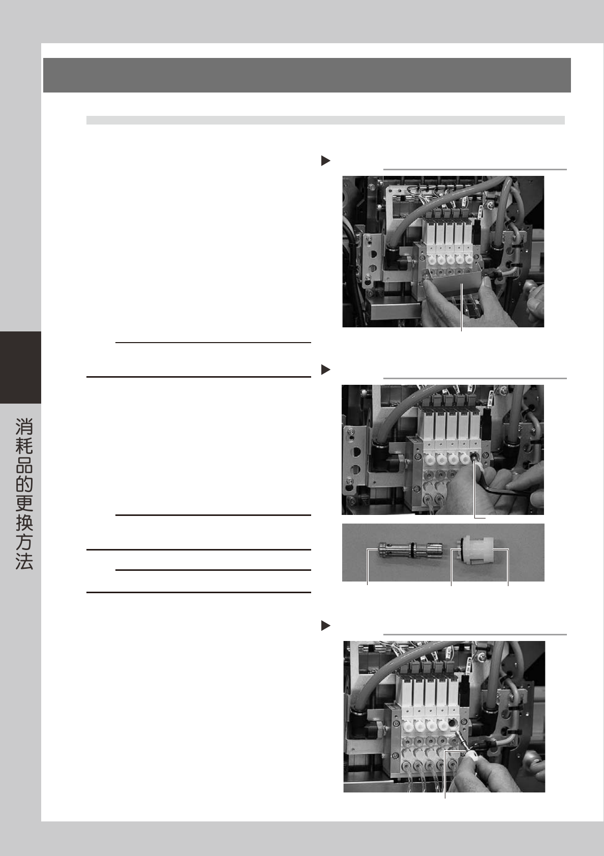 4-2 4 2. 真空电磁阀部 2.1 真空电磁阀 BIT 的更换 1 切断气源。 将贴片机左下面板内的 「供气 / 排气」 开关向右旋转, 切断供气。 2 将贴装头移至便于操作的位置。 3 拆下整流板。 用六角扳手拆下固定整流板的螺栓。 55402-L6-00 4 用手拔出 BIT。 用六角扳手向左旋转盖子并拔出后,可以看见 BIT 前端,用手拔出。 55403-L6-00 c 注意 换下的 BIT 不可再使用。重新使用可能会…