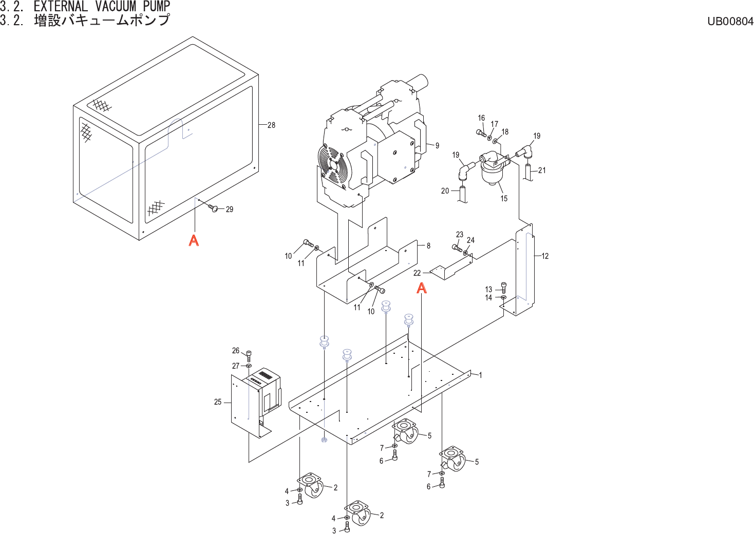 3.2. EXTERNAL VACUUM PUMP 3.2. 増設バキュームポンプ UB00804 No. Drg.No. & Code No. QTY Description Rating Materials Remarks 番号 図番 & コード番号 個数 品名 規格 材質 備考 1 PB44401 1 PLATE プレー ト FE 2 K2024R 2 CASTER キャ スタ NO.105-N OT 3 H53…