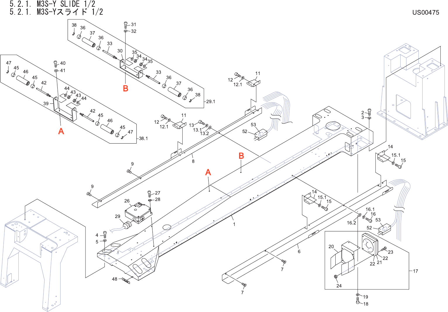 5.2.1. M3S-Y SLIDE 1/2 5.2.1. M3S-Yスライド 1/2 US00475 No. Drg.No. & Code No. QTY Description Rating Materials Remarks 番号 図番 & コード番号 個 数 品名 規格 材質 備考 1 PM72132 1 FRAME フレーム FE 2 H5341A 8 BOLT, HEX SOCKET ボルト 六角穴 M08…