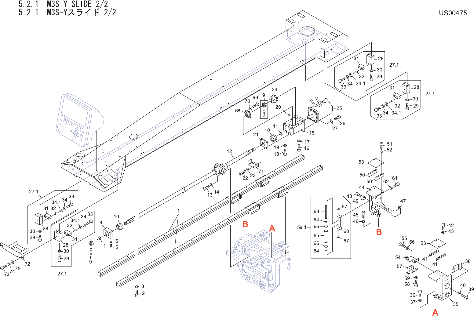 5.2.1. M3S-Y SLIDE 2/2 5.2.1. M3S-Yスライド 2/2 US00475 No. Drg.No. & Code No. QTY Description Rating Materials Remarks 番号 図番 & コード番号 個 数 品名 規格 材質 備考 1 XG00412 2 GUIDE, RAIL ガイド レール OT 2 H5263B 46 BOLT, HEX SOCKET ボ…