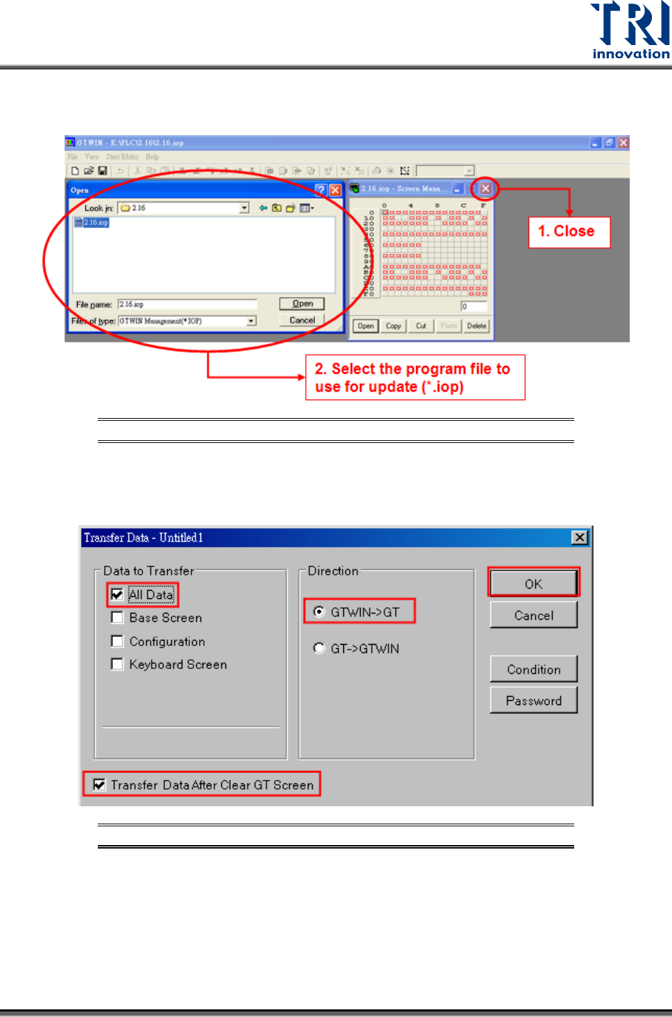 [Transfer Data After Clear GT Screen] and [GTWIN->GT]. Click [OK] as shown in the